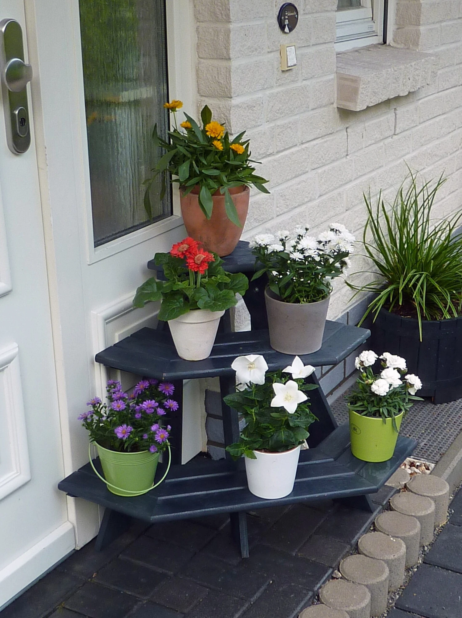 Mit diesem anthrazitfarbenen Eckelement einer Blumentreppe lassen sich ideal Hausecken verschönern. Zusammen mit dem als separaten Zubehör bestellbaren geraden Element ergeben sich verschiedene Kombinationsmöglichkeiten. Aber auch einzeln bietet dieses Eckelement einen schönen Anblick. Gefertigt aus massivem Kiefernholz, wetterfest imprägniert – für innen und außen.
