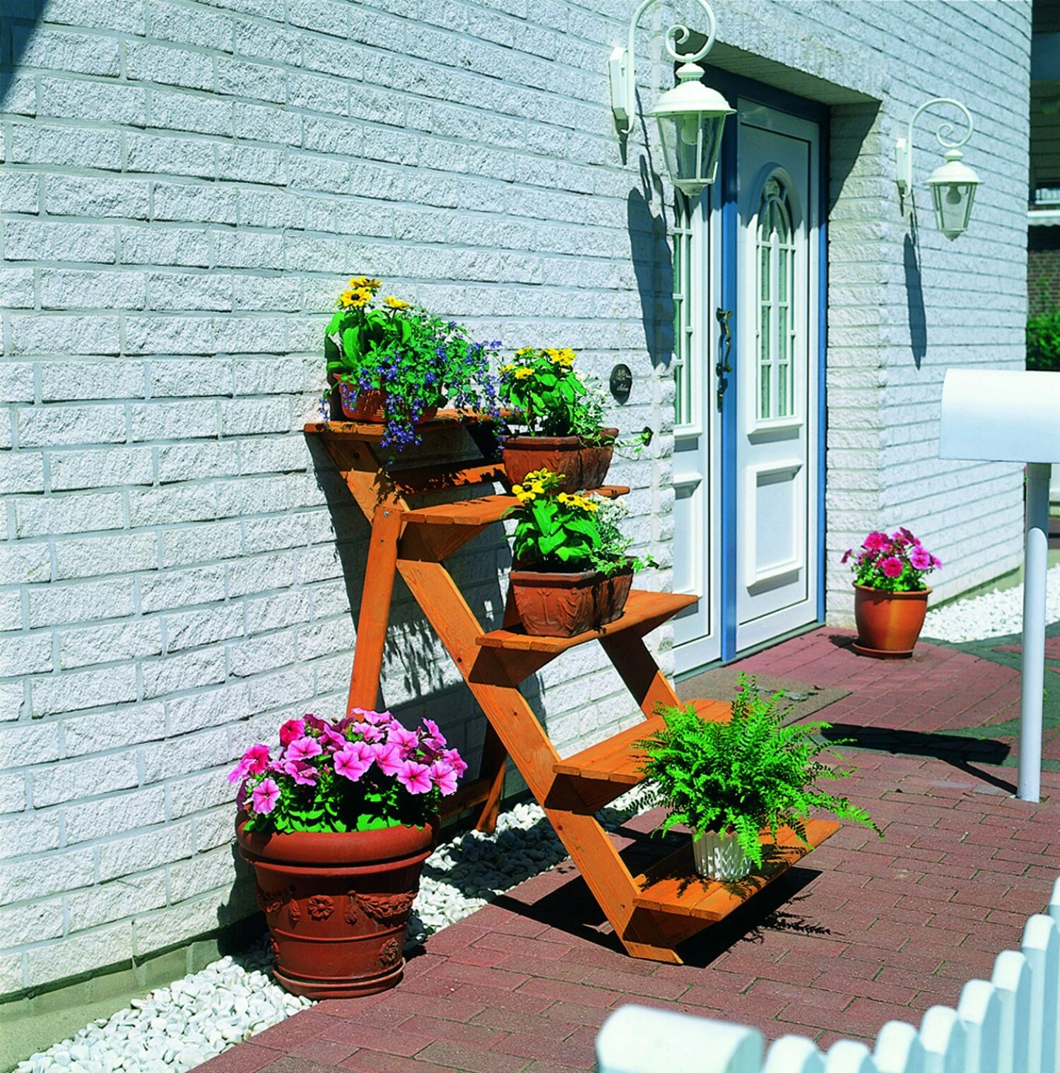 Fünf Stufen in den Blumenhimmel. Die Blumentreppe aus Kiefernholz ist wetterfest imprägniert. Leichte Montage. Maße: B 78 x T 100 x H 109 cm