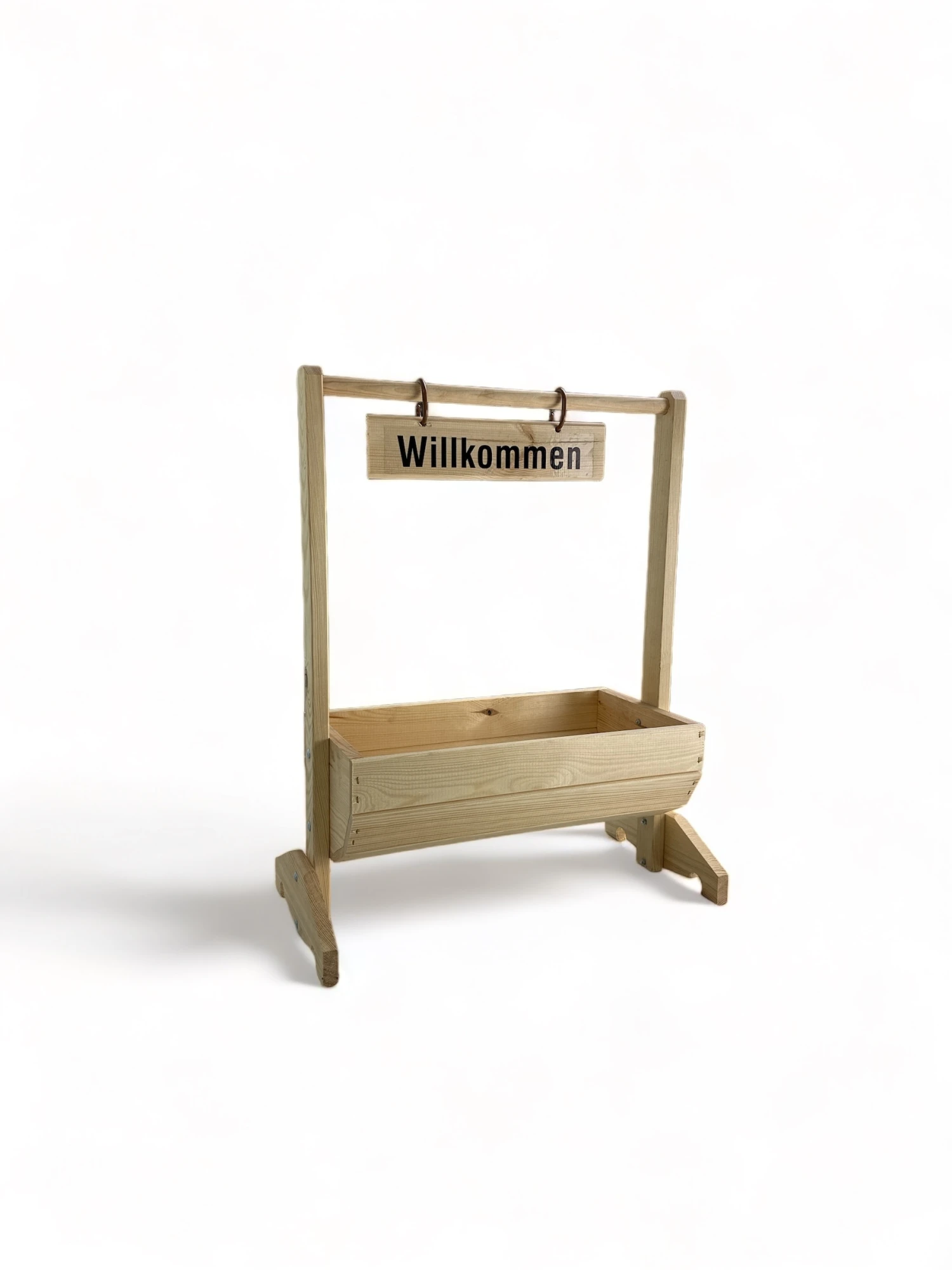Begrüßen Sie Ihre Gäste schon am Eingang. Bepflanzbarer Trog aus massivem, naturbelassenem Kiefernholz. Mit Schriftzug. Maße: L 59 x B 30 x H 73 cm; Gewicht ohne Verpackung: 3,4 kg