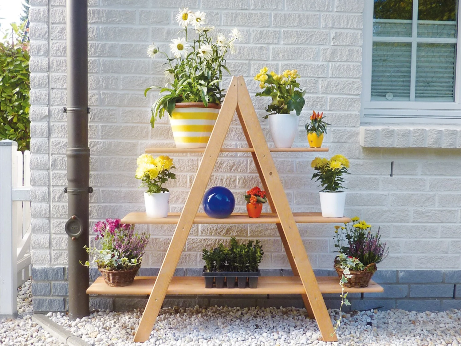 Die größte Ausführung der Blumenleiter verfügt über drei Etagen und bietet damit noch mehr Platz für Ihre Blumen. Massives Kiefernholz, imprägniert. Maße: L 137 x B 31 x H 120 cm