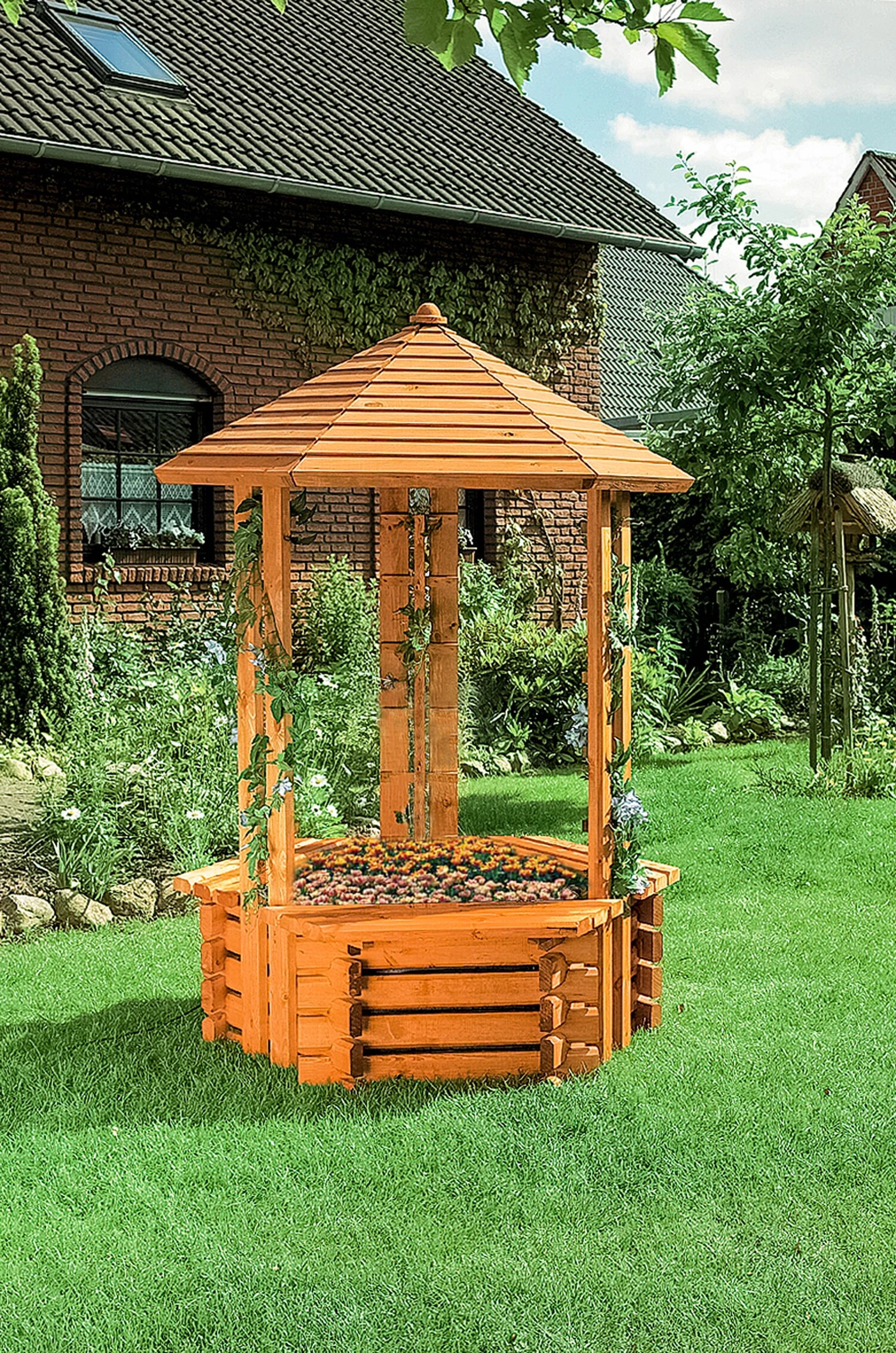 Sehr dekorativer Brunnen mit seitlichen Rankhilfen und drei Sitzbänken. Aus 3,5cm dicken Kiefernholzbohlen gefertigt und wetterfest imprägniert. Als Zubehör sind ein passender Einsatz aus frostsicherer Teichfolie, sowie eine hochwertige Teichpumpe (600 ltr/Std., 10m Kabel) mit Springbrunnendüsen lieferbar.