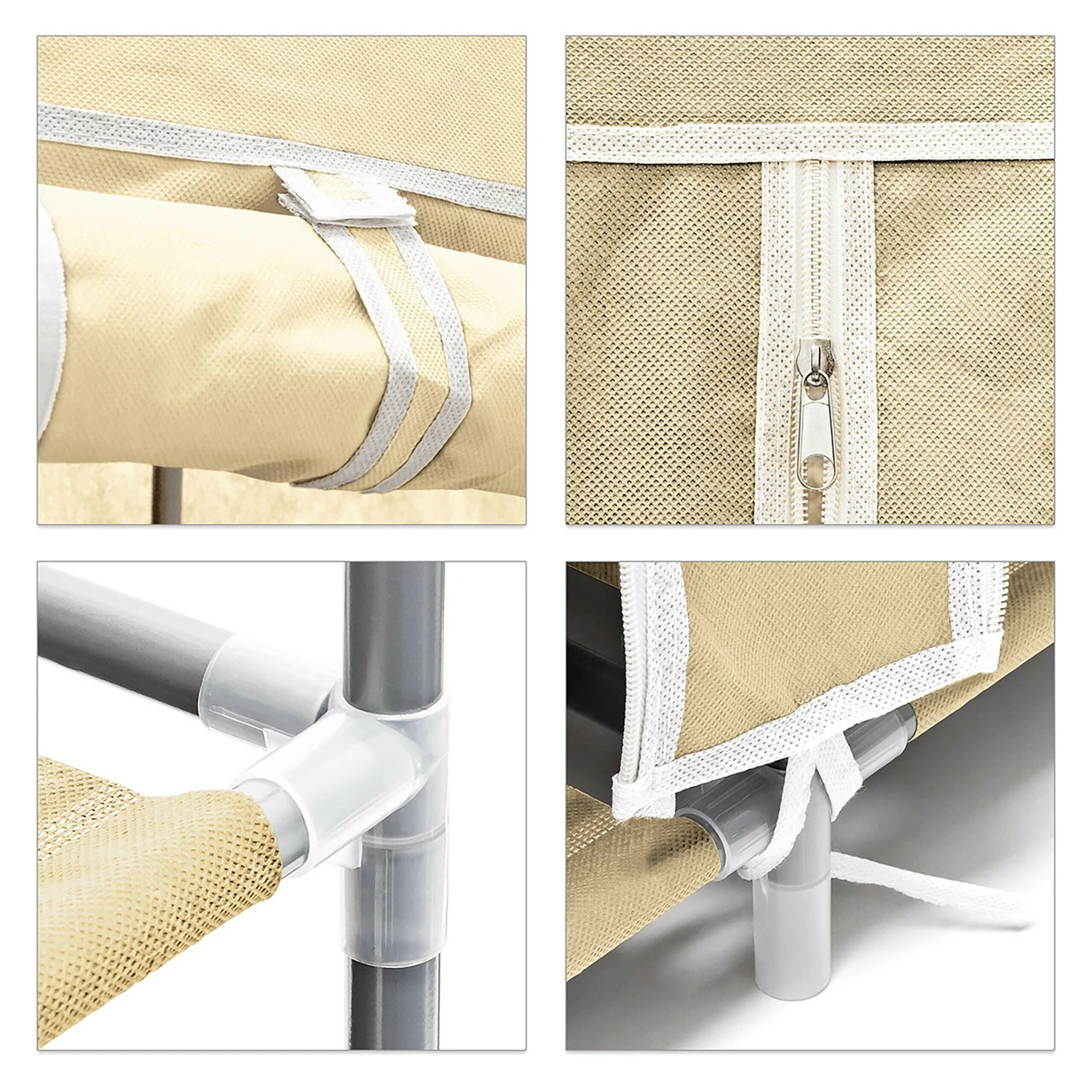 Mithilfe der beiliegenden Aufbauanleitung ist der Schuhschrank schnell aufgebaut und kann sofort genutzt werden. Wollen Sie dauerhaften Zugriff auf die Regalflächen haben, öffnen Sie die vertikalen Reißverschlüsse des Überwurfs. Rollen Sie nun die Stofftür nach oben und fixieren Sie sie mit den Klettverschlüssen. Zur allgemeinen Fixierung des Stoffbezuges binden Sie einfach die Schnüre am Boden um die Füße des Gestells.