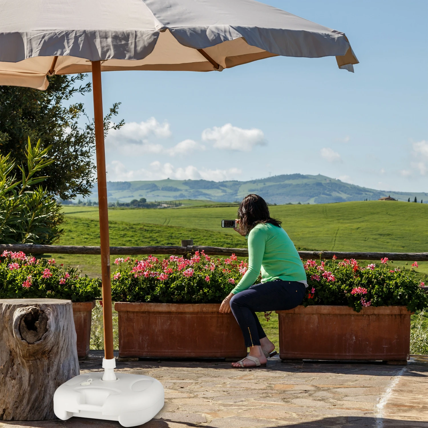 Der Schirmständer ist eine ideale Ergänzung für Ihren Sonnenschirm. Aufgrund seines leichten Gewichts im leeren Zustand kann der Schirmhalter gut über einen zusätzlichen Tragegriff transportiert werden.
