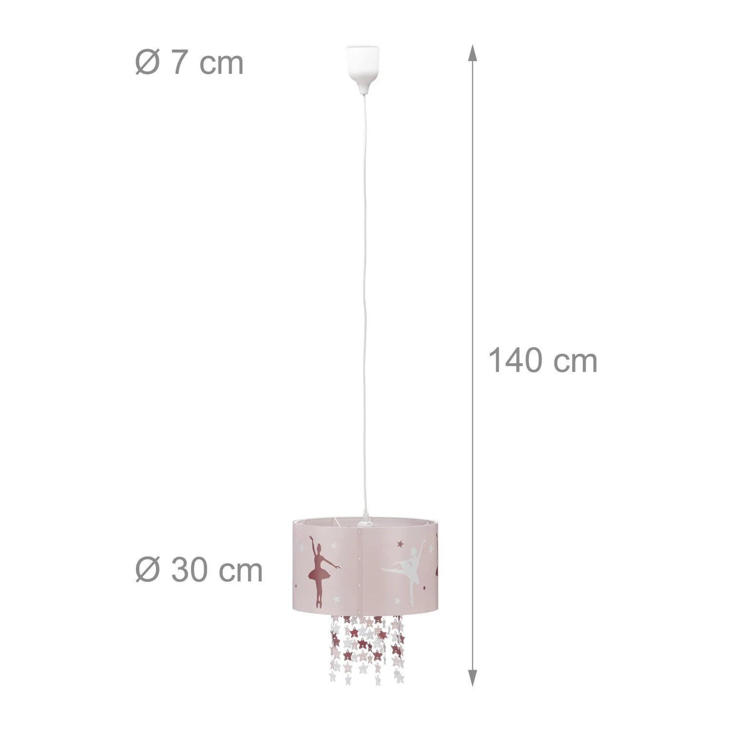 Die niedliche Kinderlampe bezaubert durch ein schönes Motiv von zwei tanzenden Ballerinen. Der runde Lampenschirm im zarten Rosa ist ein wahr gewordener Mädchentraum, der in keinem Kinderzimmer fehlen darf. Am weißen Metallgestell sind 13 Ketten mit kleinen Sternen befestigt, die bei eingeschaltetem Licht faszinierende Schatten auf Wände und Boden werfen. So kann Ihr Kind wie die Ballerina umringt von Sternen tanzen.