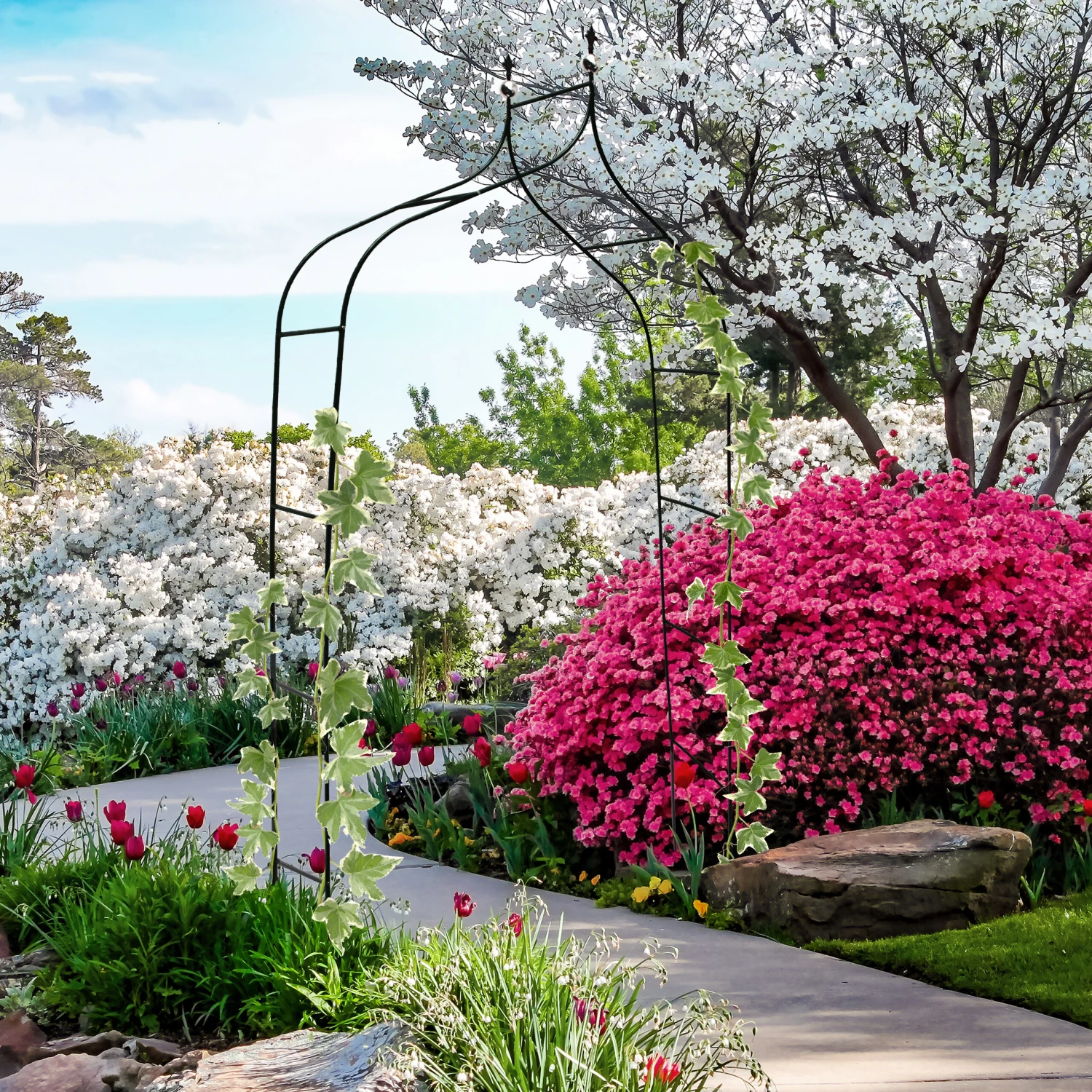 Zusammenstecken, verschrauben, eingraben und schon haben Sie einen witterungsbeständigen Gartenbogen, der als Garteneingang, intime Hochzeitskulisse oder Blumenoase dient.