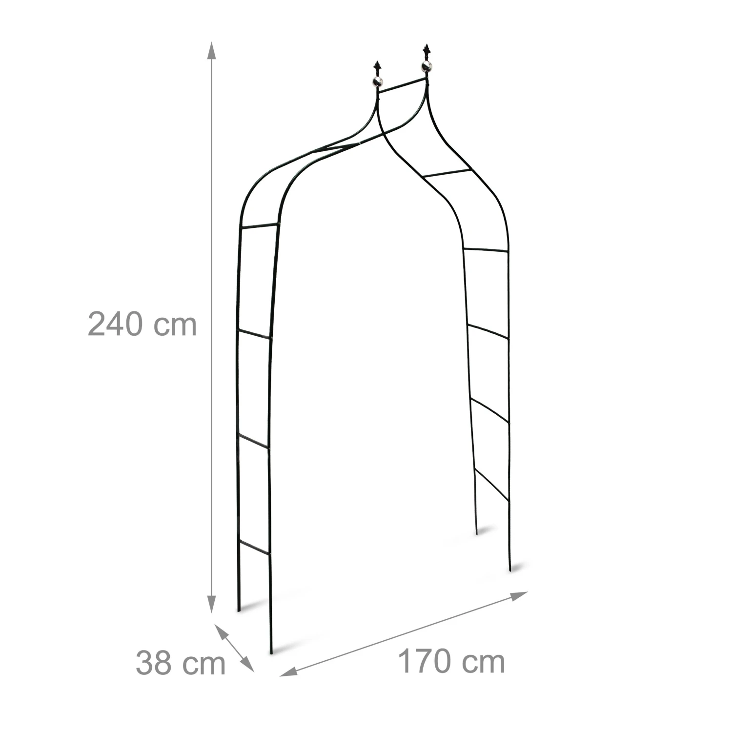 Mit diesem dekorativen Rankbogen aus Metall geben Sie Ihren Kletterpflanzen einen schönen Platz zum Wachsen. Der royal anmutende Rosenbogen mit Lilien-Spitzen und Silberkugeln gibt Rosen und Clematis Form und Halt. Das 240 cm hohe Rankgestell aus robustem Stahlrohr misst max. 170 cm in der Breite. Flexible Materialeigenschaften und eine moderne Bauweise ermöglichen eine Reduzierung der Breite auf min. 140 cm.