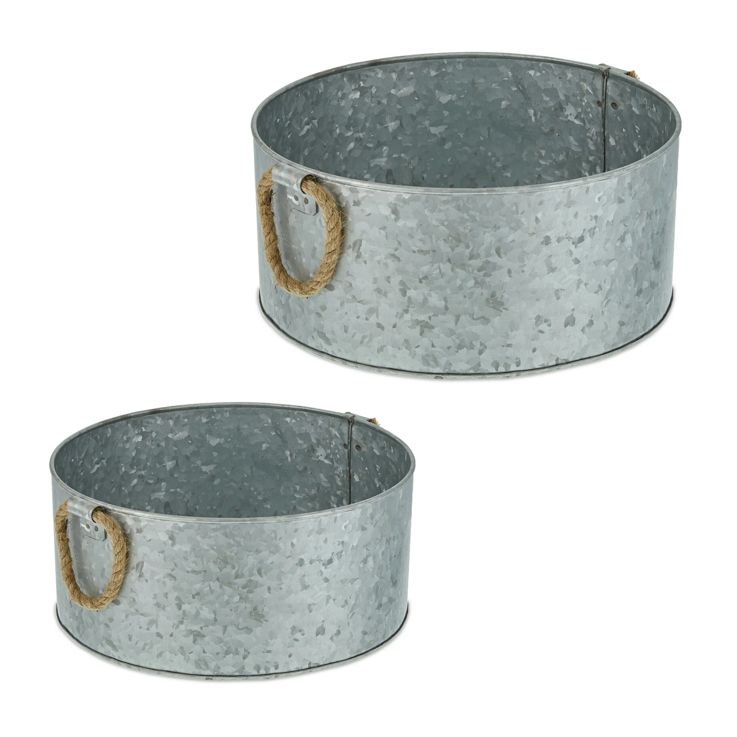 Das Pflanztöpfe 2er Set ist für die Verwendung auf dem Balkon, auf der Terrasse oder im Garten gedacht. Natürlich können Sie die Zinkschalen auch indoor verwenden und auf der Fensterbank schöne Blumen und schmackhafte Kräuter anbauen. Das Set besticht durch seinen rustikalen Vintage-Look, denn die Pflanzgefäße erinnern an Zinkwannen und Zinkeimer aus längst vergangenen Zeiten. Die perfekten Dekoelemente also! Die runden Blumenkästen sind mit praktischen Tragegriffen aus Jute ausgestattet.