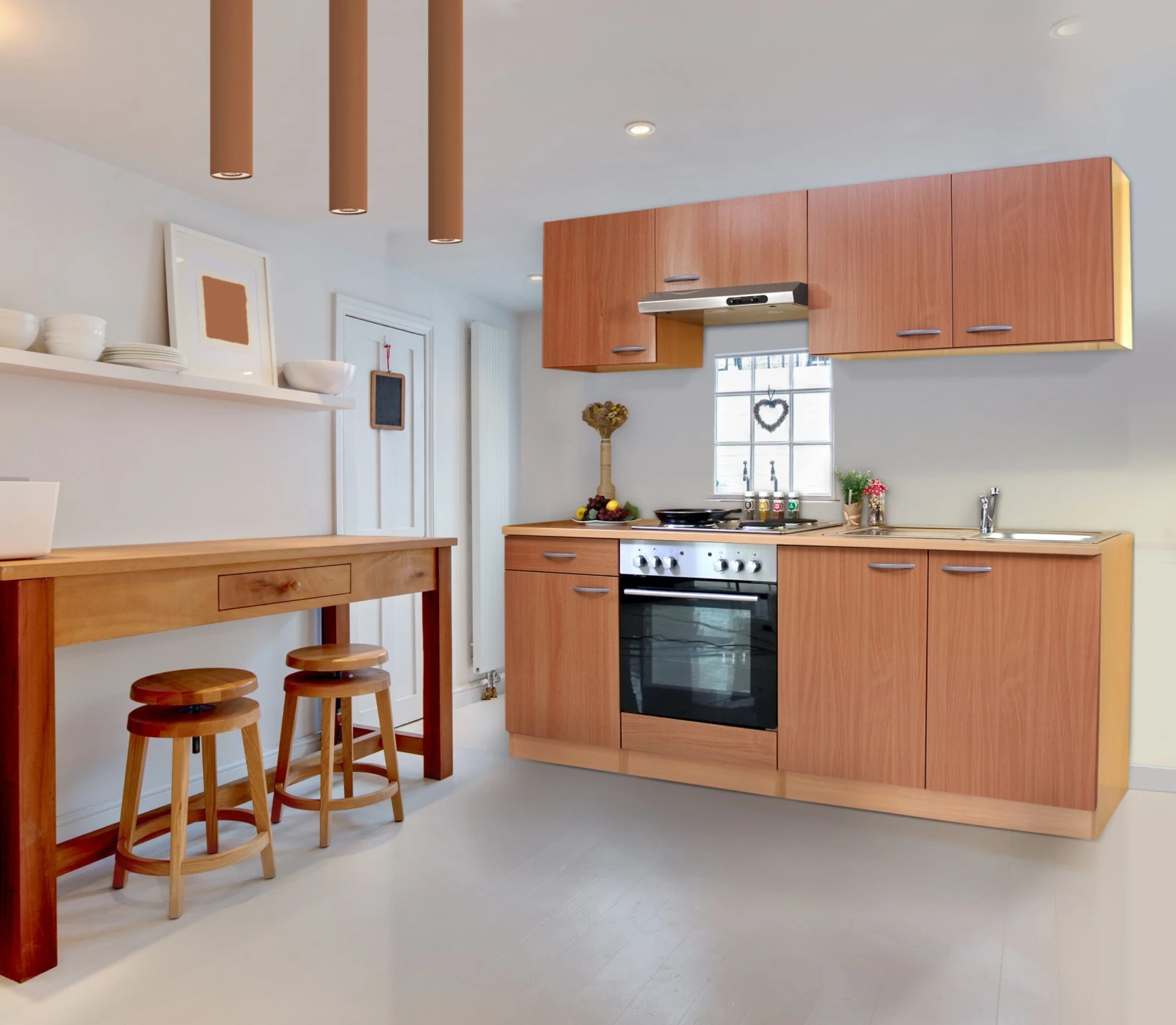 Die in Buche gehaltene Küchenzeile gibt ihrer Küche ein besonderen Touch im stilvollem Design. Lassen Sie sich überraschen, wie sich praktisches Nutzen und strahlende Optik kombinieren lassen.