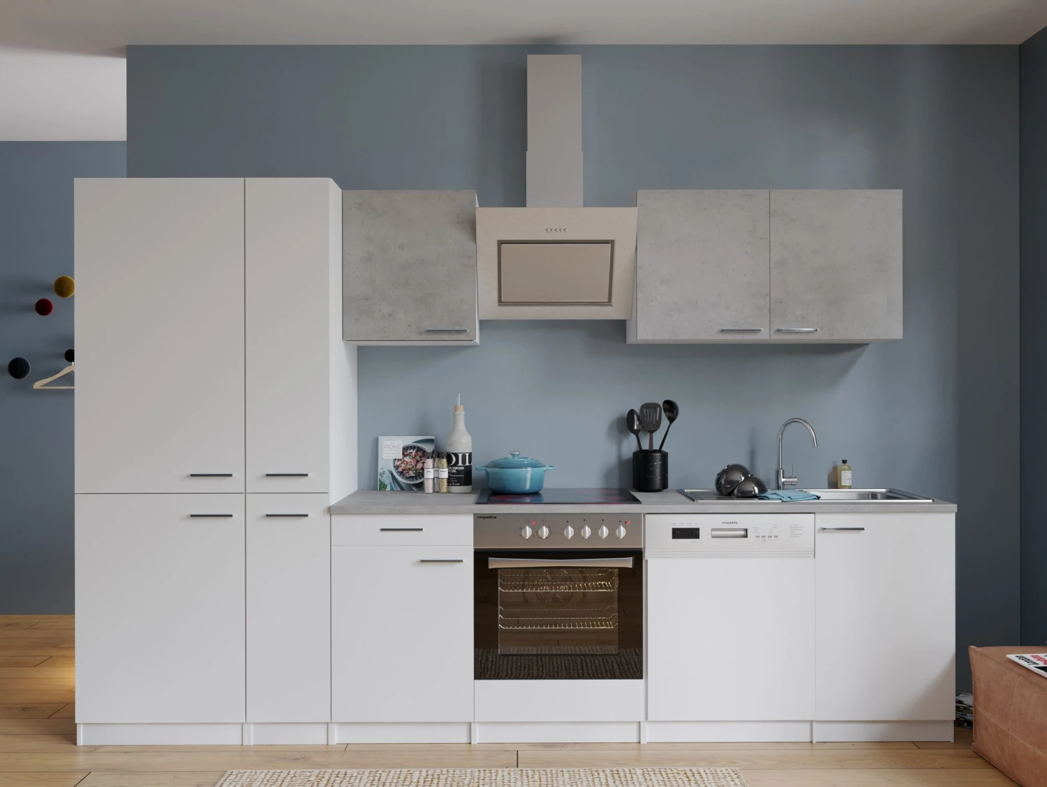 Wunderschöne Küchenzeile 310 cm Korpus Weiß & Arbeitsplatte und Oberschrankfronten in Beton Optik