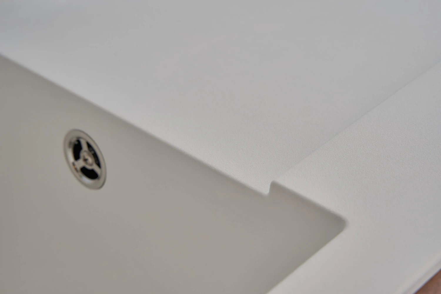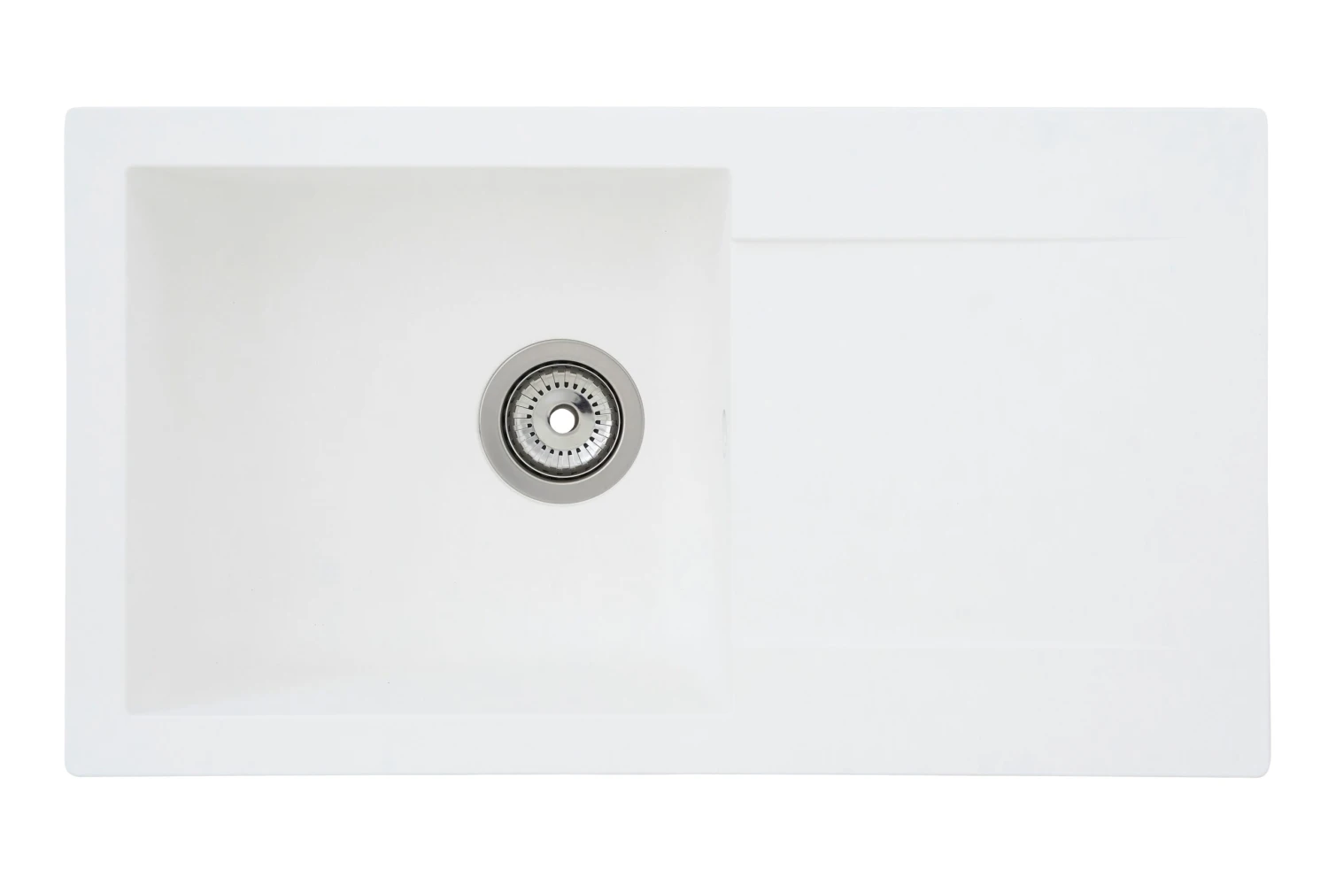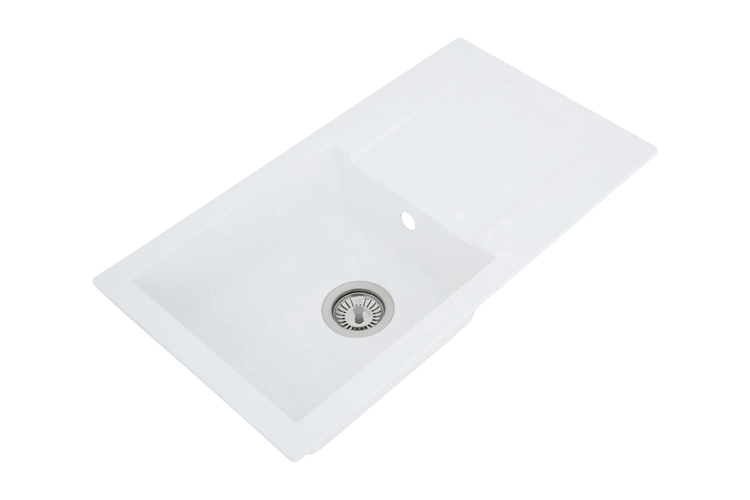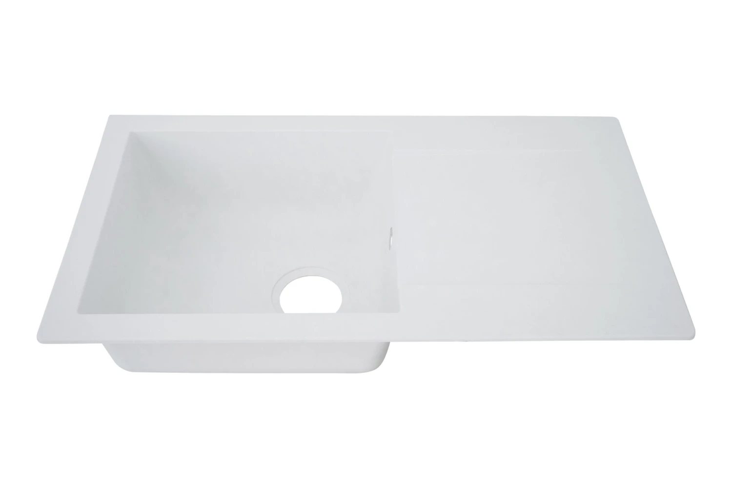 Die Mineralite Einbauspüle mit Abtropffläche „Denver“ ist geeignet für Spülenunterschränke ab 45 cm. Die Hahnlöcher sind nicht durchgestoßen. Die Spüle besteht zu 40% aus Kunstharz und zu 60% aus Verbundmaterial (Mineralstoffe und Glasfasern). Die Ab- und Überlaufgarnitur ist im Lieferumfang enthalten. Der Artikel wird ohne Armatur geliefert.