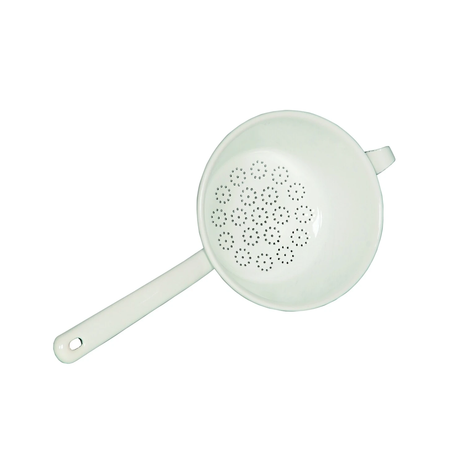 Das Küchensieb von Riess heißt zwar Passiersieb, ist jedoch auch zum Abseihen oder Waschen von jeglichem Obst, Salat und Gemüse wie ein Küchensieb einsetzbar. Der lange Stiel und der gegenüber am Rand des Siebes angebrachte Haken, machen es einfach das Sieb auf einem passenden Topf oder Schüssel zu fixieren. Der Boden ist mit blütenförmig angeordneten Bodenlöchern durchsetzt.