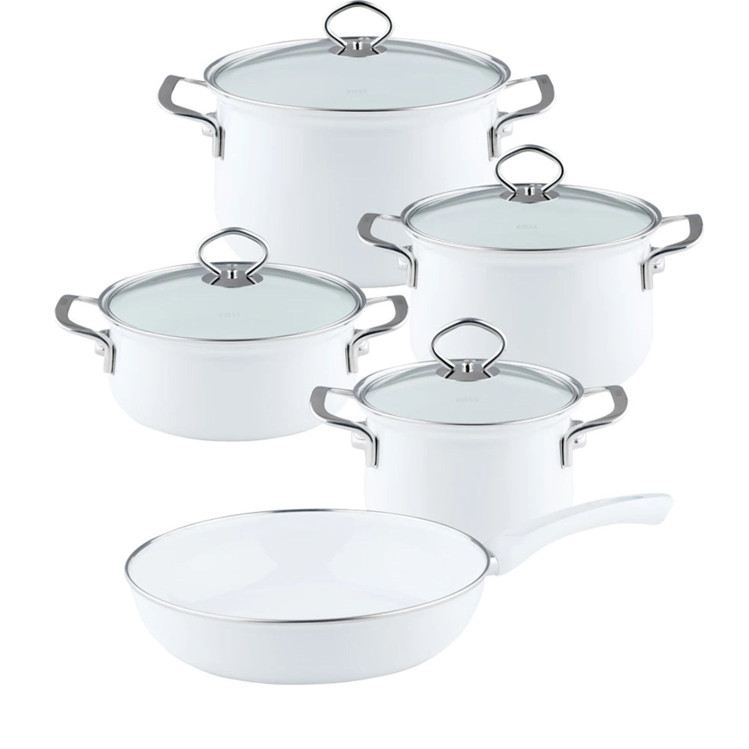 Unsere Geschirrset der Nouvelle Serie besticht durch modernes Design und einem spannenden Materialmix. Die Kasserollen und Kochtöpfe des Topfsets haben handlich geformte Edelstahlgriffe in modernem Design, die Pfanne einen ergonomischen Kunststoffgriff. Der Edelstahl bzw. Kunststoff verhindert das Heißwerden der Griffe. Die Deckel der Kasserollen und Töpfe sind aus Glas und haben ebenfalls einen Edelstahlgriff. Der starke Stahl- Wärmespeicherboden sorgt dafür, dass sich die Wärme gleichmäßig und rasch verteilt. Das Geschirr-Set besteht aus: Fleischtopf mit Glasdeckel 16, 20, 24 cm, Kasserolle mit Glasdeckel 20 cm, Email Pfanne 28 cm.