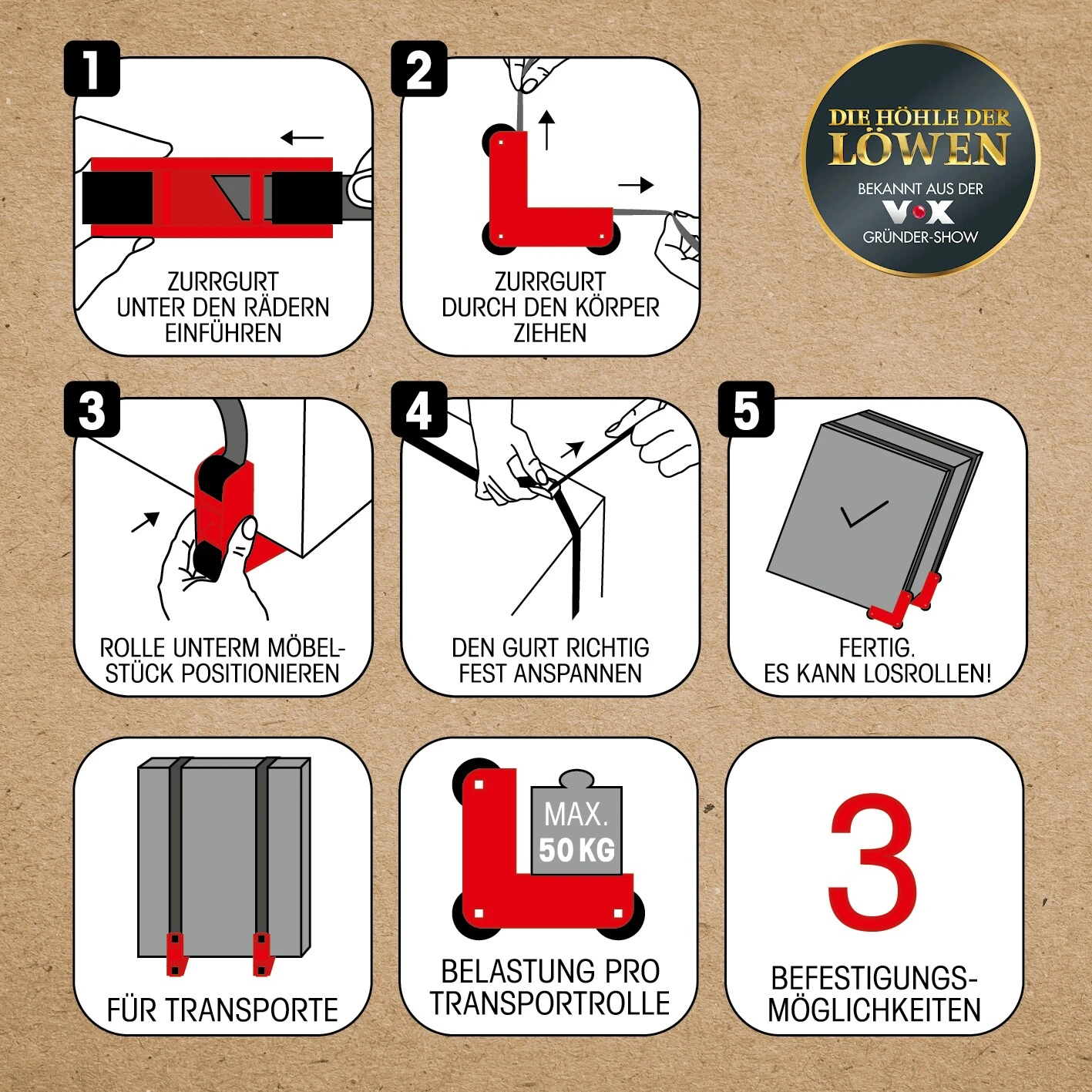 - 3 Befestigungsmöglichkeiten: Festzurren, Schrauben oder Kleben – inklusive 2 Zurrgurten und 12 Klebepunkten