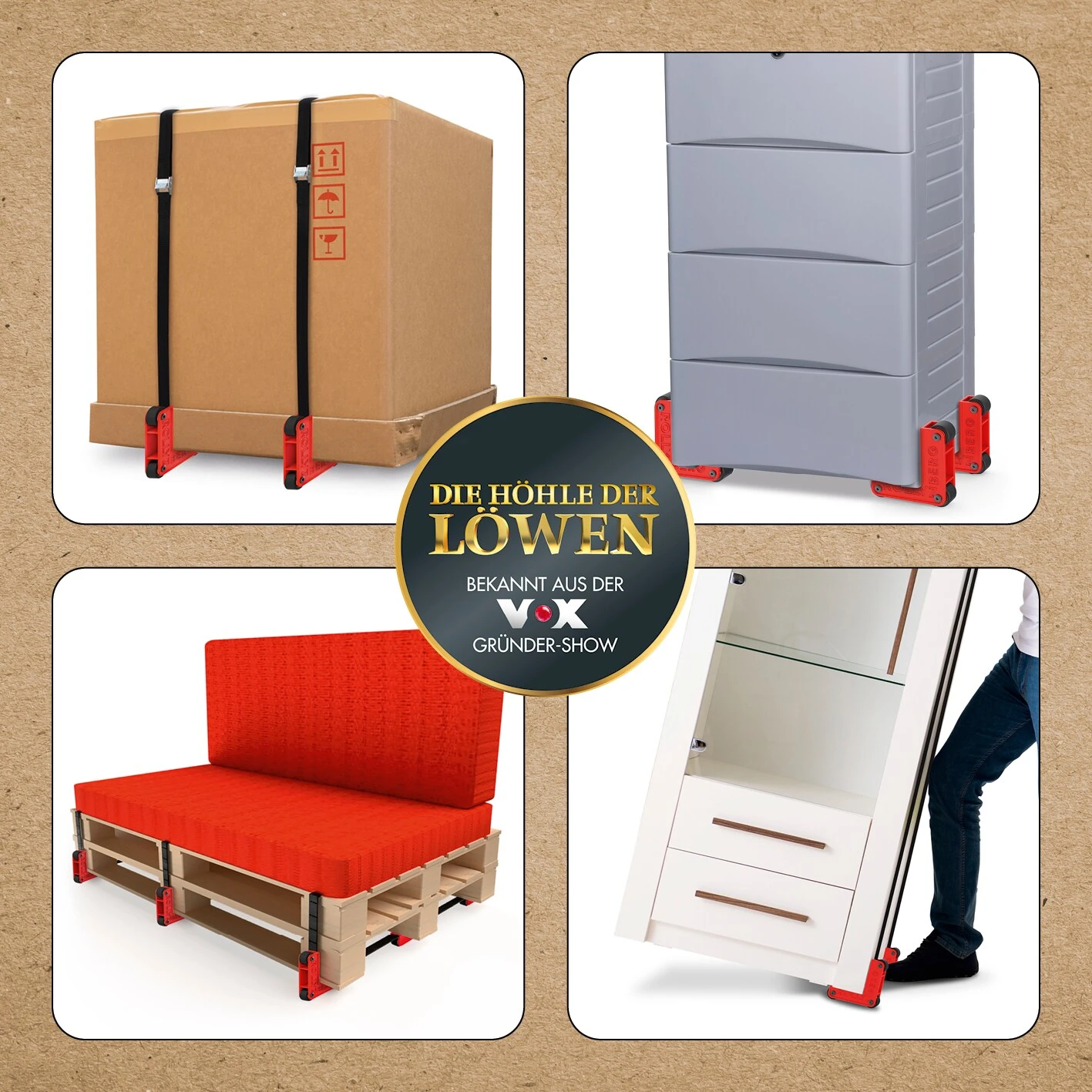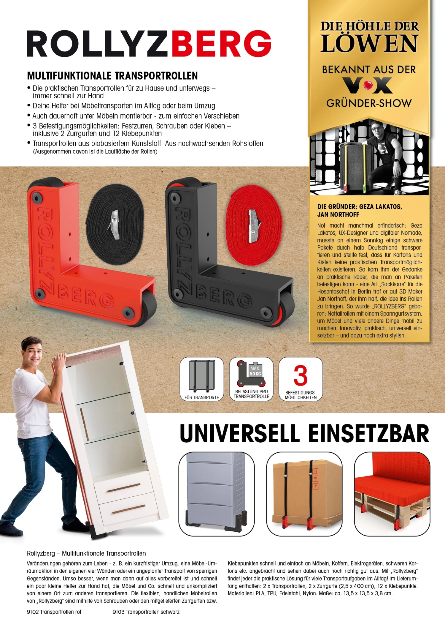 Veränderungen gehören zum Leben – und können manchmal auch recht spontan passieren, z. B. bei einem kurzfristigen Umzug, einer Möbel-Umräumaktion in den eigenen vier Wänden oder beim ungeplanten Transport von sperrigen Gegenständen. Umso besser, wenn man dann auf alles vorbereitet ist und schnell ein paar kleine Helfer zur Hand hat, die Möbel und Co. schnell und unkompliziert von einem Ort zum anderen transportieren. Die flexiblen, handlichen Möbelrollen von „Rollyzberg“ sind mithilfe von Schrauben oder den mitgelieferten Zurrgurten bzw. Klebepunkten schnell und einfach an Möbeln, Koffern, Elektrogeräten, schweren Kartons etc. angebracht und sehen dabei auch noch richtig gut aus. Du kannst sie sogar dauerhaft als Rollen für deine Möbel verwenden und sie dadurch nicht nur mobiler, sondern auch zu echten Hinguckern machen – mit ihrem minimalistischen Design verleihen sie jedem Möbelstück sofort einen modernen, urbanen Touch. Ob Großstadtnomade oder Landliebhaber, ob Single oder Familienmensch, mit „Rollyzberg“ findet jeder die praktische Lösung für viele Transportaufgaben im Alltag!