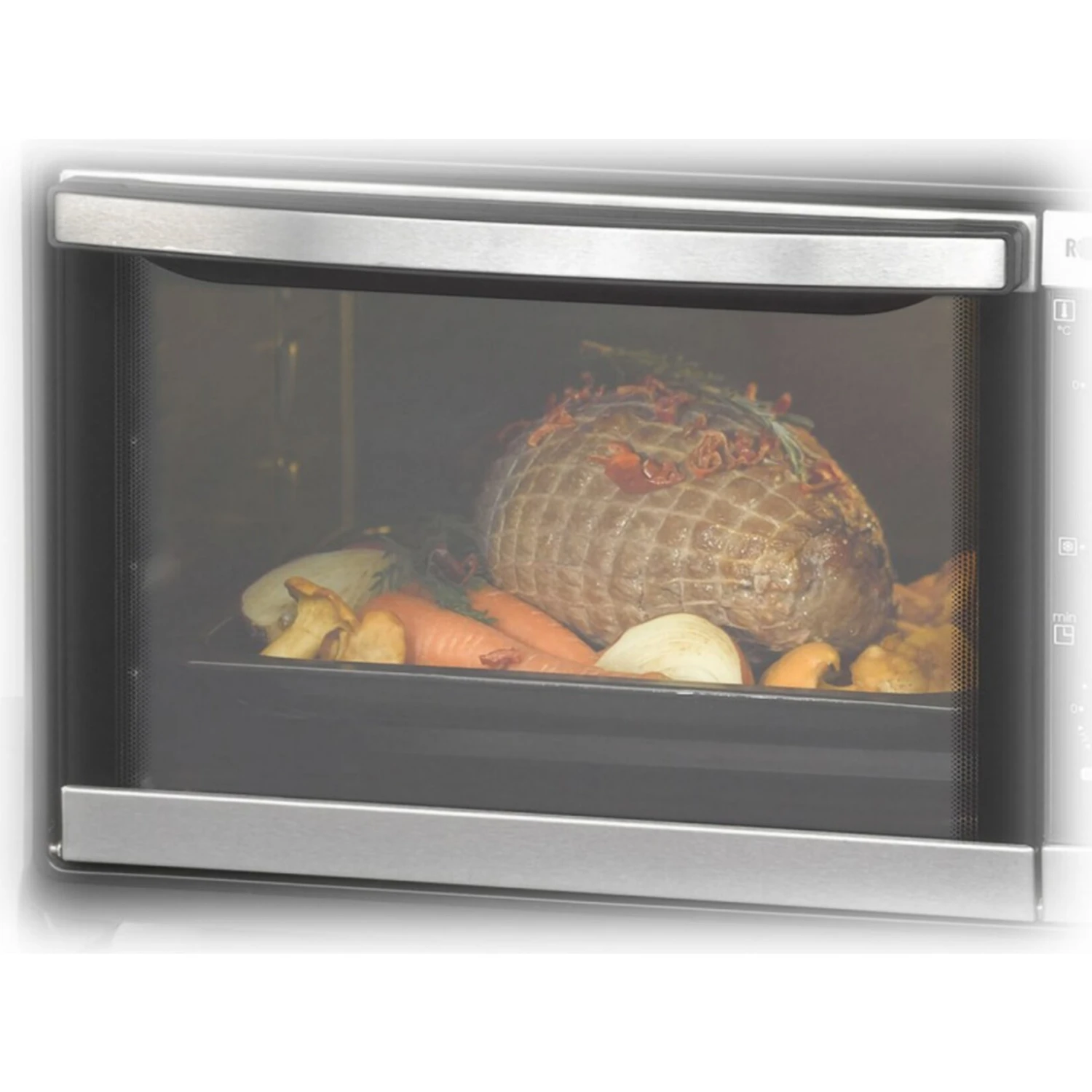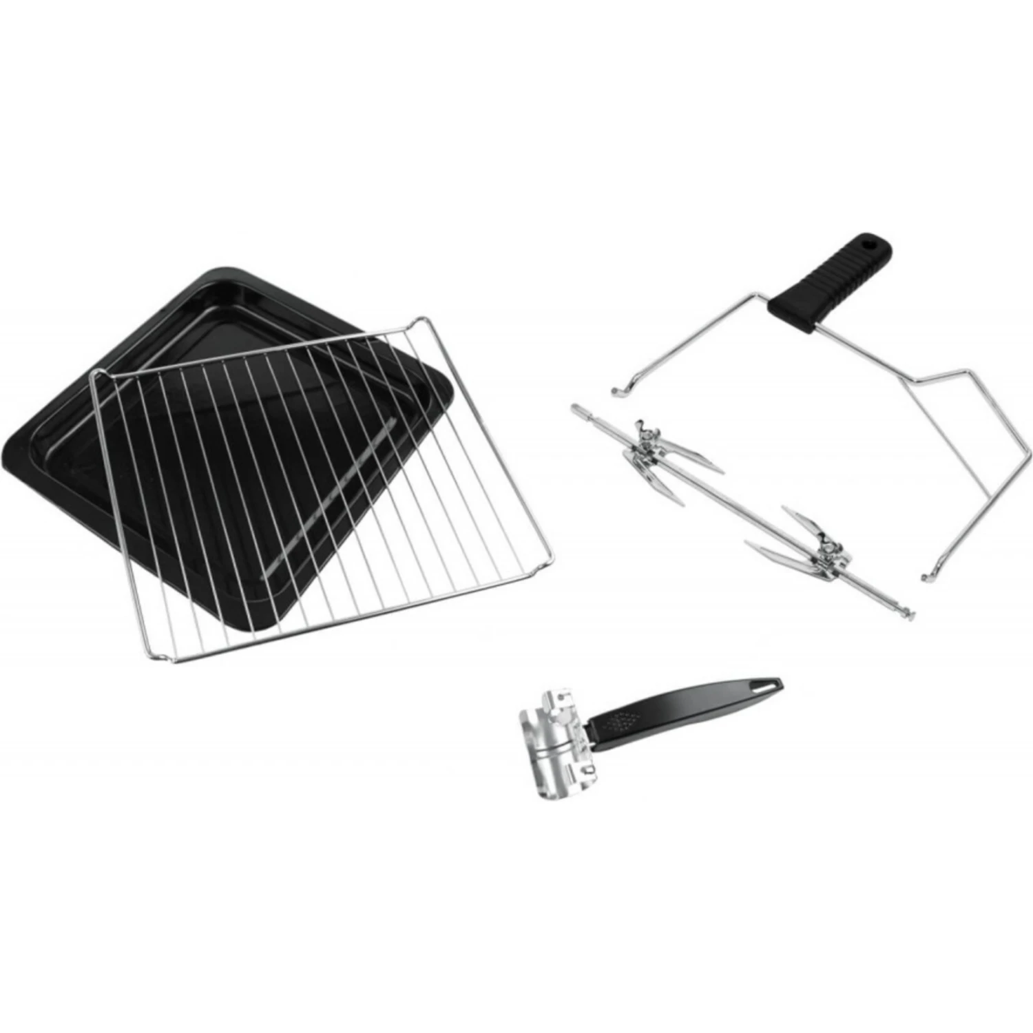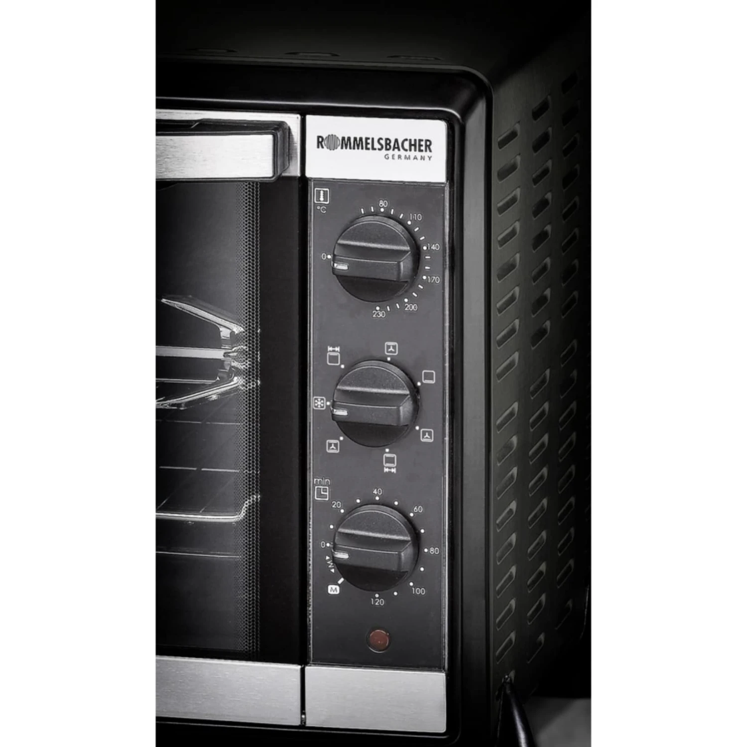 Der Rommelsbacher Back & Grill Ofen mit Umluft BG 1550 ist ideal für den kleinen Haushalt und eine gute Ergänzung für jede Küche. Mit dem Drehspieß gelingen auch knusprige Hähnchen. Die getrennt regelbare Ober- und Unterhitze lässt Braten und Aufläufe perfekt garen und die Umluftfunktion sorgt für gleichmäßige Backergebnisse bei Kuchen und Pizzen. Eine separate Auftaufunktion macht die Vielseitigkeit des Back & Grill Ofen mit Umluft BG 1550 vollkommen. Was auch immer man zubereitet, es gelingt mühelos. Die kurze Aufheizzeit der Edelstahl Heizelemente und die zweifach verglaste Backofentür mit Backraumdichtung helfen zudem beim Energiesparen. Angenehmen Bedienkomfort bieten die 120 Minuten Zeitschaltuhr mit Dauerstellung und Signalton, die stufenlose Temperaturregelung von 80°C bis 230°C, sowie die praktische Innenbeleuchtung des Backraums. Und dank der Antihaftbeschichtung des Back & Grill Ofen mit Umluft BG 1550 ist dieses attraktive Gerät auch sehr einfach zu reinigen.