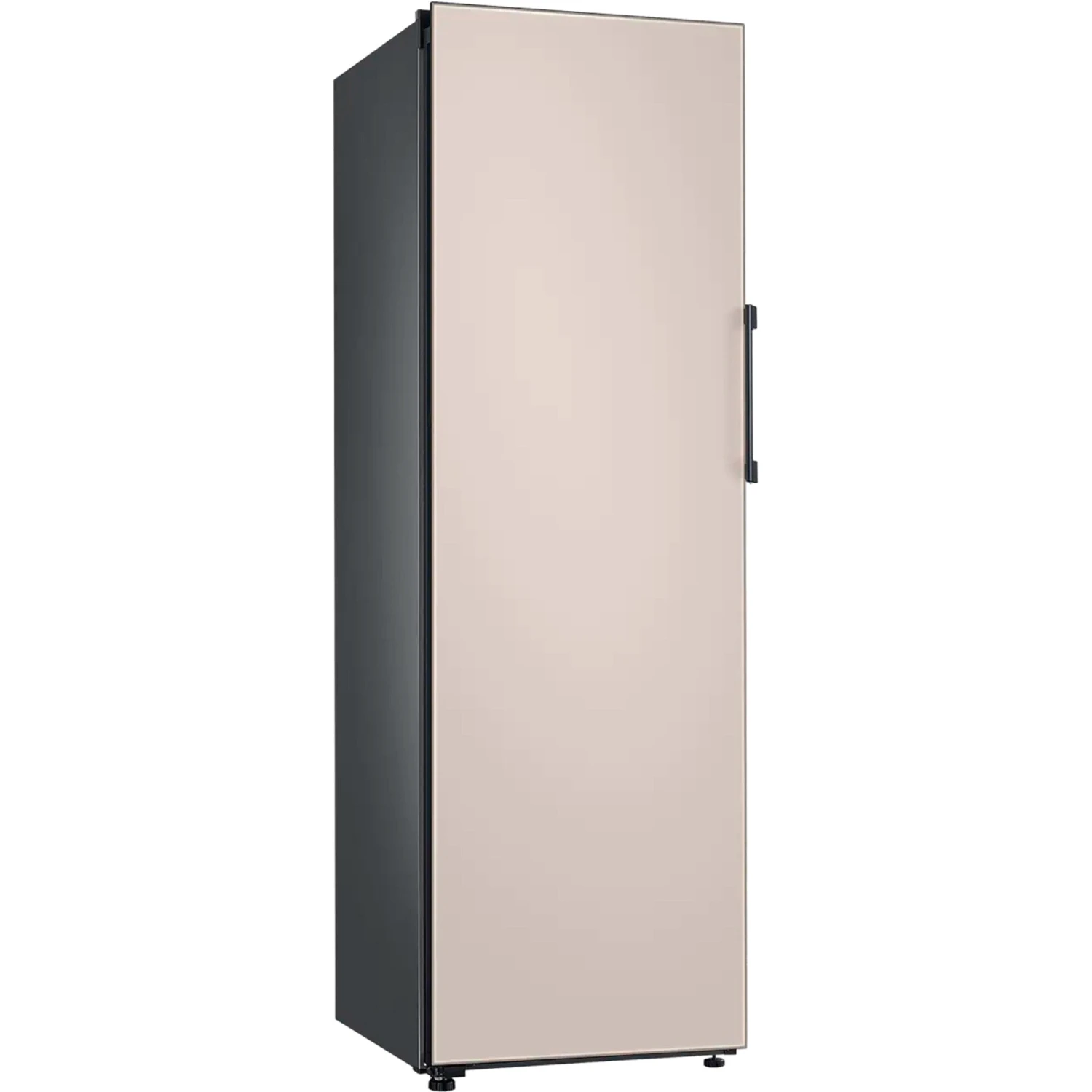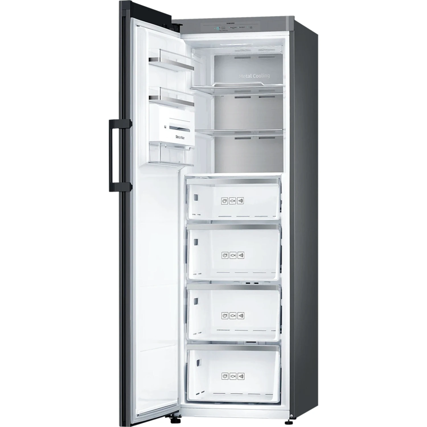 Der Gefrierschrank Bespoke RZ32A748548/EG von SAMSUNG bietet einen Gesamtnutzinhalt von 323 Litern und besticht durch sein stilvoll-minimalistisches und modulares Design. Er stellt drei Abstellflächen, drei Gefrierschubladen sowie zwei Türfächer für die übersichtliche Lagerung von Gefriergut zur Verfügung. Der Slim Ice Maker hält stets eine Portion Eiswüfel für gekühlte Getränke parat. No Frost+ leitet die entstehende Feuchtigkeit nach außen und verhindert damit Eisbildung. Somit spart man gleich doppelt Energie: keine Eisschichten im Eisfach und kein Hochkühlen nach dem Abtauen. Die gleichbleibende Kühlung auf jeder Ebene des RZ32A748548/EG wird unterstützt durch All-Around Cooling – ein ausgeklügeltes System zur Belüftung, welches die Temperatur im gesamten Innenraum auf ein gleichmäßiges Niveau herunterregelt. Die elegante Metall-Innenrückwand sorgt für eine gleichmäßige Innentemperatur, zudem wird die gewünschte Temperatur durch die in der Metallplatte gespeicherte Kälte nach dem Öffnen und Schließen der Tür schnell wieder erreicht. Die Temperaturregelung und Funktionssteuerung erfolgt über das Innenliegende Display und dank Smart Conversion lässt sich der Gefrierschrank bei Bedarf per Knopfdruck in einen Kühlschrank umwandeln. Mit einem Stromverbrauch von 329 kWh im Jahr ist der RZ32A748548/EG in die Energieeffizienzklasse F eingestuft.