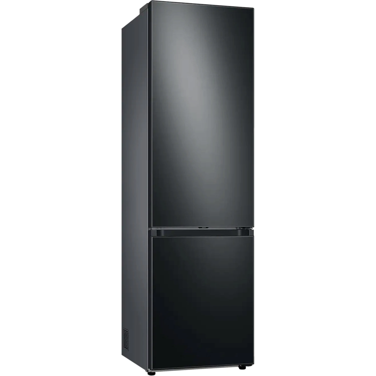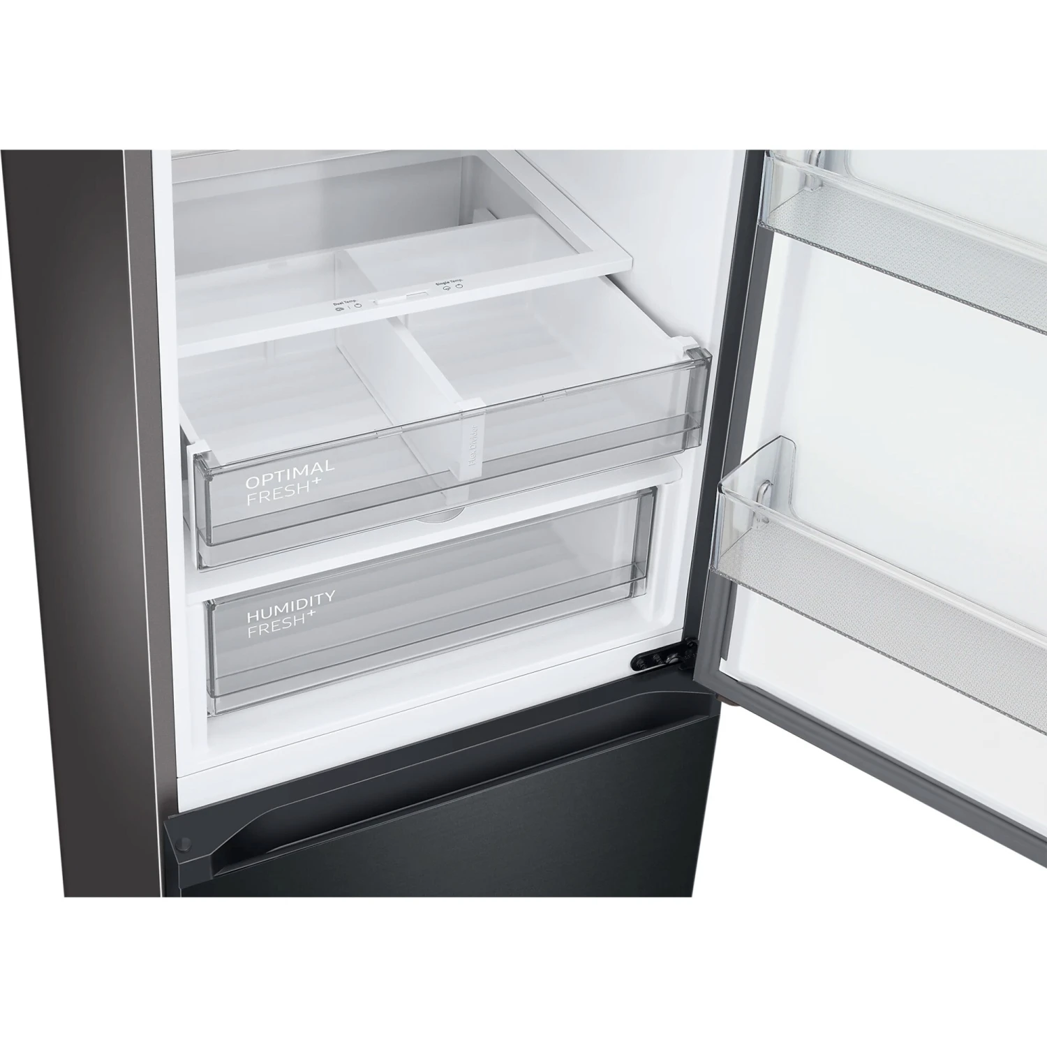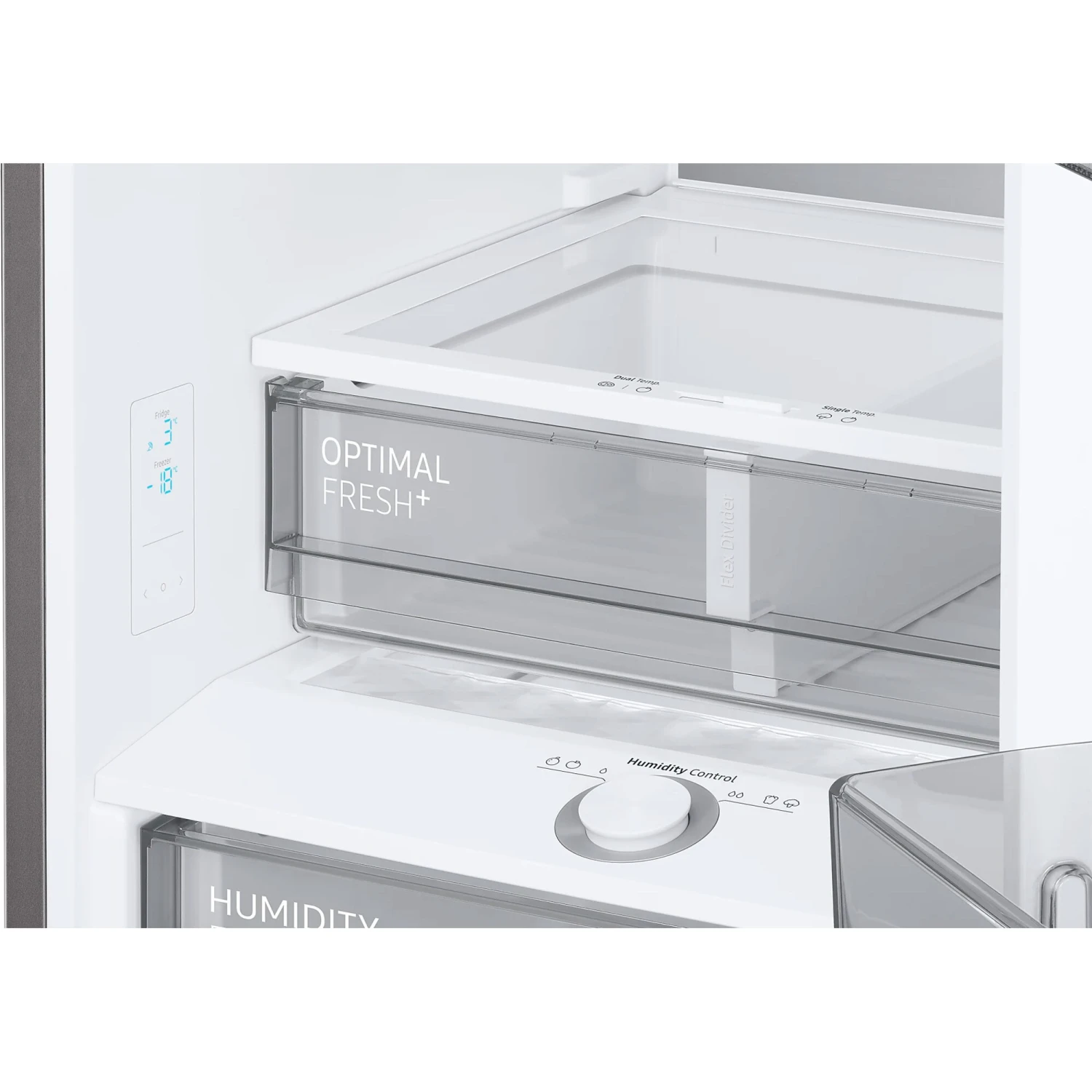 Die Kühl-/Gefrierkombination Bespoke RL38A7B63B1/EG von SAMSUNG bietet einen Gesamtnutzinhalt von 387 Litern und besticht durch ihr stilvoll-minimalistisches und modulares Design. Im Kühlbereich stehen für die übersichtliche Lagerung frischer Lebensmittel drei Abstellflächen, davon eine Slide & Fold Ablage, eine Humidity Fresh+ Schublade mit anpassbarer Feuchtigkeit für Obst und Gemüse, eine Optimal Fresh+ Schublade mit zwei separat regelbaren Temperaturzonen sowie vier Türfächer zur Verfügung. Die elegante Metall-Innenrückwand sorgt für eine gleichmäßige Innentemperatur, zudem wird die gewünschte Temperatur durch die in der Metallplatte gespeicherte Kälte nach dem Öffnen und Schließen der Tür schnell wieder erreicht. Der Gefrierbereich der RL38A7B63B1/EG ist mit drei Schubladen für Gefriergut ausgestattet. Das Cool Select+ Fach bietet mit vier möglichen Temperatureinstellungen große Flexibilität: Sie lässt sich als Kühlschrankerweiterung (2 °C oder -1 °C), zum sanften Auftauen (-5 °C) oder als Gefrierbereich (-17 °C bis -23 °C) nutzen. NoFrost+ leitet die entstehende Feuchtigkeit nach außen und verhindert damit die Eisbildung in Gefrier- und Kühlbereich und dank Twin Cooling+ sorgen zwei getrennte Kühlkreisläufe dafür, dass zwischen Kühl- und Gefrierbereich kein Luftaustausch stattfindet, sodass die Geruchs- und Geschmacksübertragung reduziert und ein Feuchtigkeitsaustausch zwischen den Zonen verhindert wird. Durch das Betätigen der Power-Cool- und Power-Freeze-Tasten wird automatisch die niedrigste Temperatur eingestellt (1 °C/-23 °C), wodurch die entsprechenden Bereiche so schnell wie möglich heruntergekühlt werden. Die Temperaturregelung und Funktionssteuerung der RL38A7B63B1/EG erfolgt über das innenliegende Display. Mit einem Stromverbrauch von 169 kWh im Jahr ist die RL38A7B63B1/EG in die Energieeffizienzklasse C eingestuft.