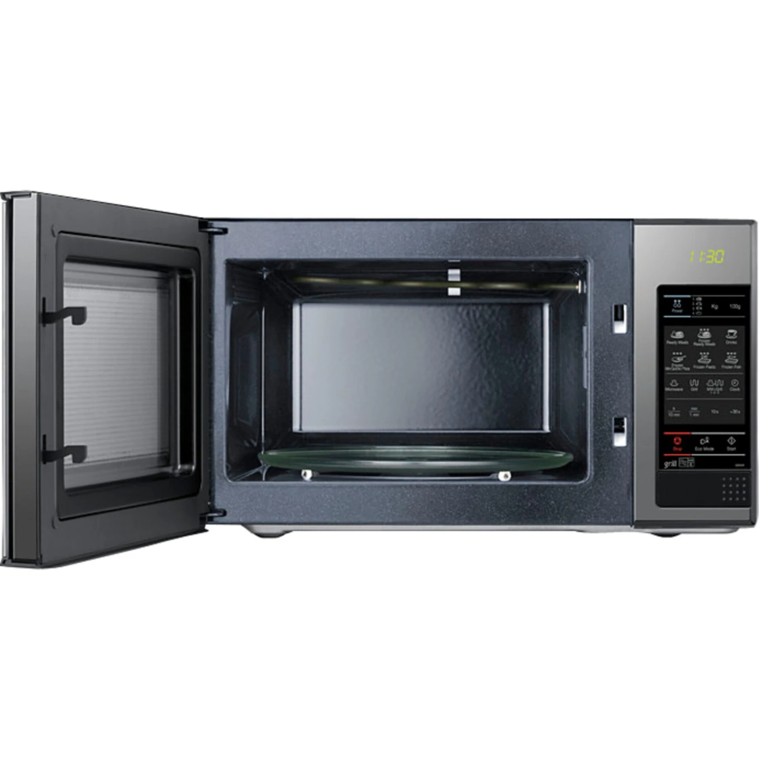 Die Samsung Mikrowelle GE83X überzeugt mit 23 Litern Nutzinhalt und Grillfunktion. Ihre Keramik-Innenbeschichtung sorgt für hohe Beständigkeit gegen Kratzer und verhindert, dass Gerüche und Geschmäcker aufgenommen und beim nächsten Kochvorgang übertragen werden. Außerdem haften Fett und Schmutz nicht an der glatten Oberfläche und lassen sich ohne zu schrubben mit einem feuchten Tuch abwischen. Die Uhrzeitanzeige der GE83X lässt sich im 12- oder 24-Stunden-System anzeigen. Für mehr Sicherheit sorgt die Kindersicherung.