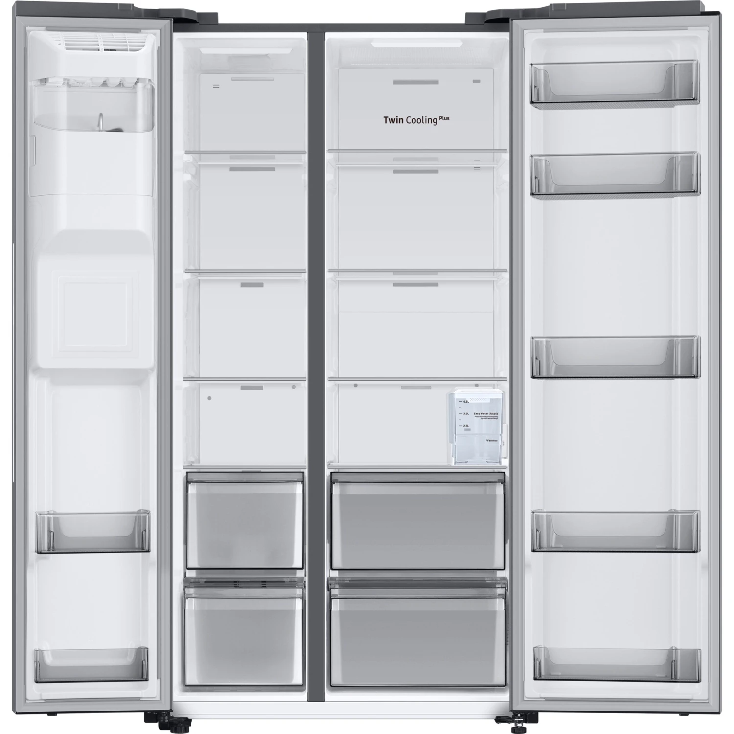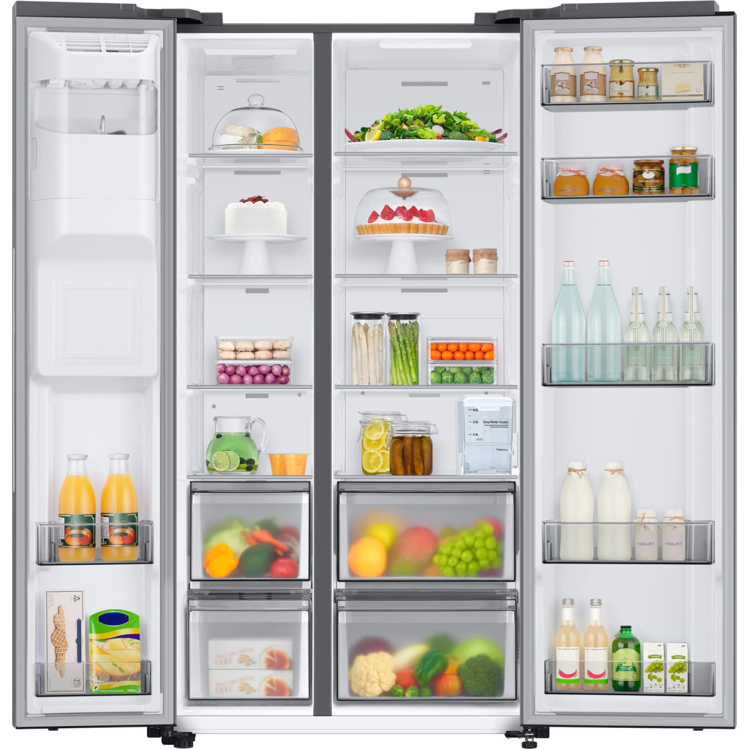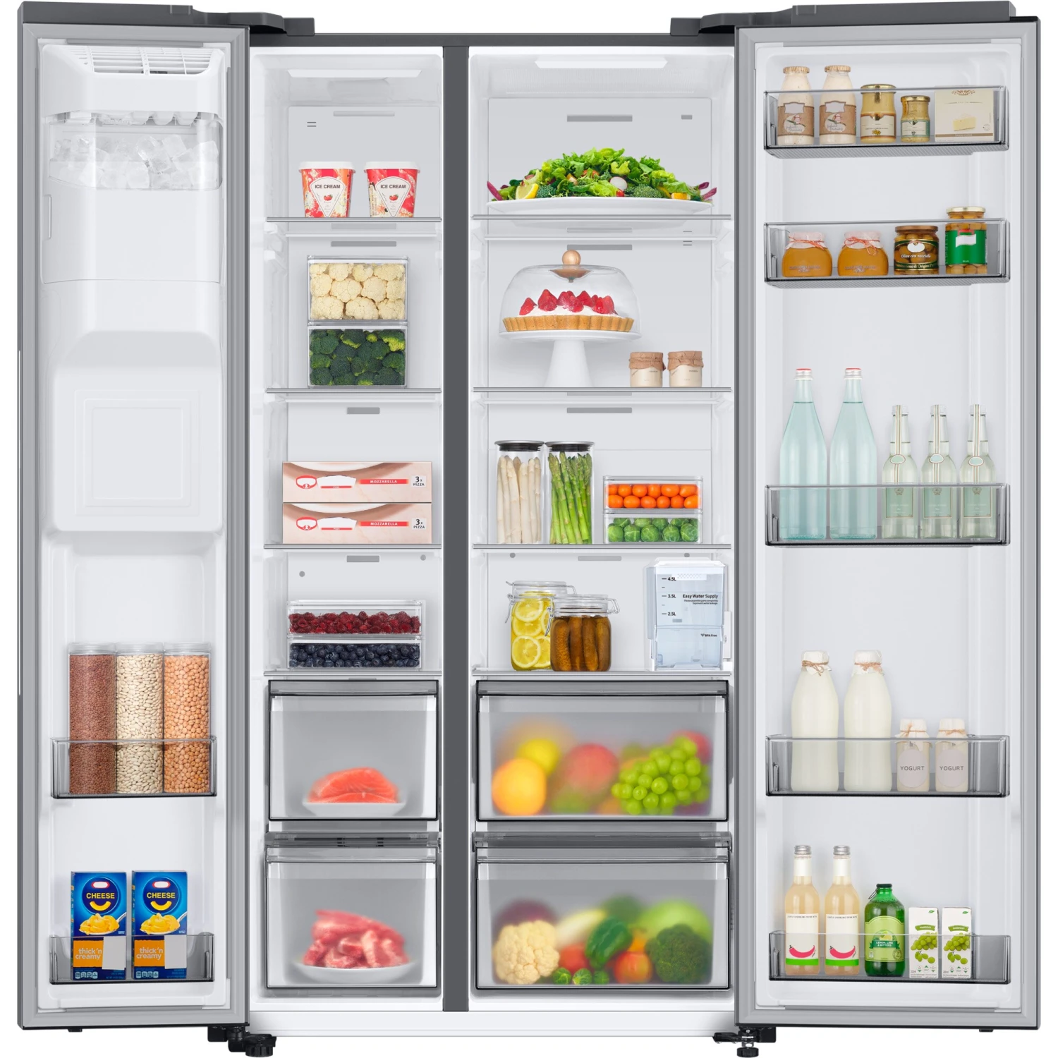Der Side-by-Side Samsung RS6GA8521S9/EG ist mit einem Gesamtnutzinhalt von 634 Litern optimal für den großen Haushalt geeignet und überzeugt mit diversen Features. Im 409 Liter umfassende Kühlbereich haben frische Lebensmittel auf vier Abstellflächen, in zwei Obst-/Gemüseschubladen sowie in fünf Türfächern jede Menge Platz, um übersichtlich gelagert zu werden. Precise Cooling sorgt dafür, dass Lebensmittel länger frisch bleiben und ihren Geschmack und ihre Textur beibehalten. Der Gefrierbereich mit NoFrost+ gegen Eis- und Reifbildung umfasst 225 Liter und ist mit zwei Gefriergutschubladen sowie vier Abstellflächen und zwei Türfächern ausgestattet. Mit Smart Conversion ist man noch flexibler bei der Kühlung der Lebensmittel, denn dank Twin Cooling+ lassen sich beide Bereiche des RS6GA8521S9/EG separat ansteuern und man kann zwischen fünf verschieden Modi auswählen – zum Beispiel um das linke Gefrierfach als normales Kühlfach zu verwenden oder eine Seite auszuschalten um Energie zu sparen. Für den besonderen Komfort sorgt der In-Door Icemaker mit integriertem 4,5-Liter-Wassertank für Wasser, Eiswürfel und Crushed Ice auf Knopfdruck. Darüber hinaus überzeugt der RS6GA8521S9/EG unter anderem mit PowerFreeze- und PowerCool-Funktion, Urlaubsschaltung sowie einem Smart Sensor. Alle Einstellungen lassen sich über die leicht zugänglichen Bedienknöpfe vornehmen, welche auch von einem Rollstuhl aus zu erreichen sind. Mit einem Stromverbrauch von 351 kWh im Jahr ist der RS6GA8521S9/EG in die Energieeffizienzklasse E eingestuft.