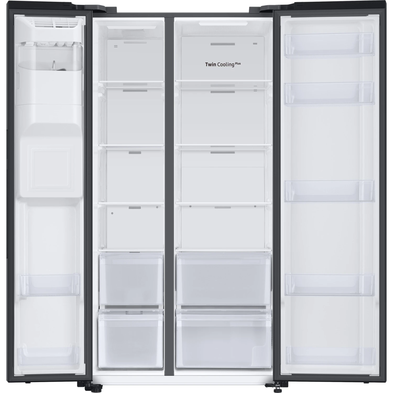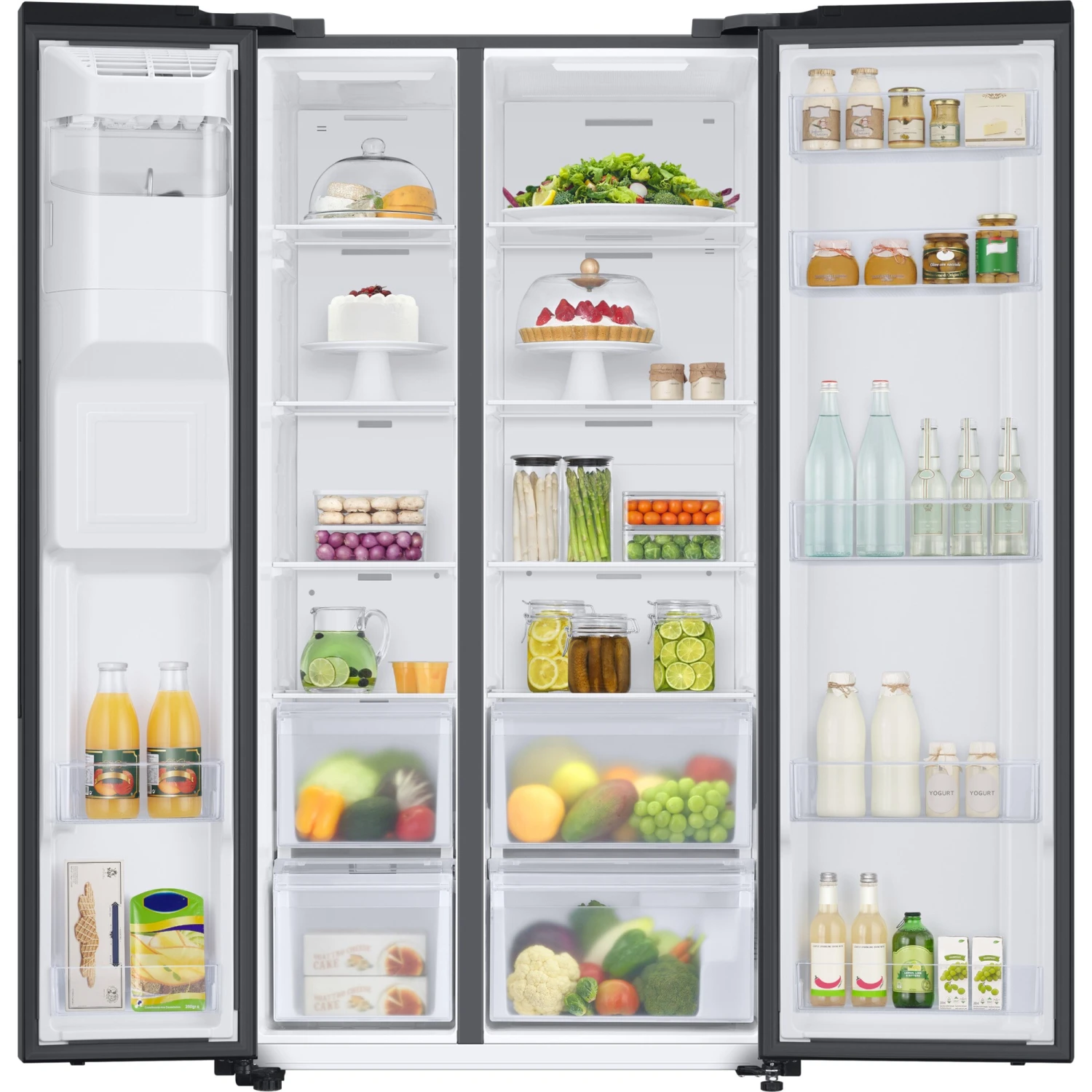 Der Side-by-Side Samsung RS6JA8811B1/EG ist mit einem Gesamtnutzinhalt von 634 Litern optimal für den großen Haushalt geeignet und überzeugt mit diversen Features. Im 409 Liter umfassende Kühlbereich mit Multi-Airflow-System haben frische Lebensmittel auf vier Abstellflächen, in zwei Obst-/Gemüseschubladen sowie in fünf Türfächern jede Menge Platz, um übersichtlich gelagert zu werden. Der Gefrierbereich mit NoFrost+ gegen Eis- und Reifbildung umfasst 225 Liter und ist mit zwei Gefriergutschubladen sowie vier Abstellflächen und zwei Türfächern ausgestattet. Für den besonderen Komfort sorgt der In-Door Icemaker mit Festwasseranschluss für Wasser, Eiswürfel und Crushed Ice. Darüber hinaus überzeugt der RS6JA8811B1/EG unter anderem mit PowerFreeze- PowerCool-Funktion, Urlaubsschaltung und Smart Sensor. Mit einem Stromverbrauch von 351 kWh im Jahr ist der RS6JA8811B1/EG in die Energieeffizienzklasse E eingestuft.