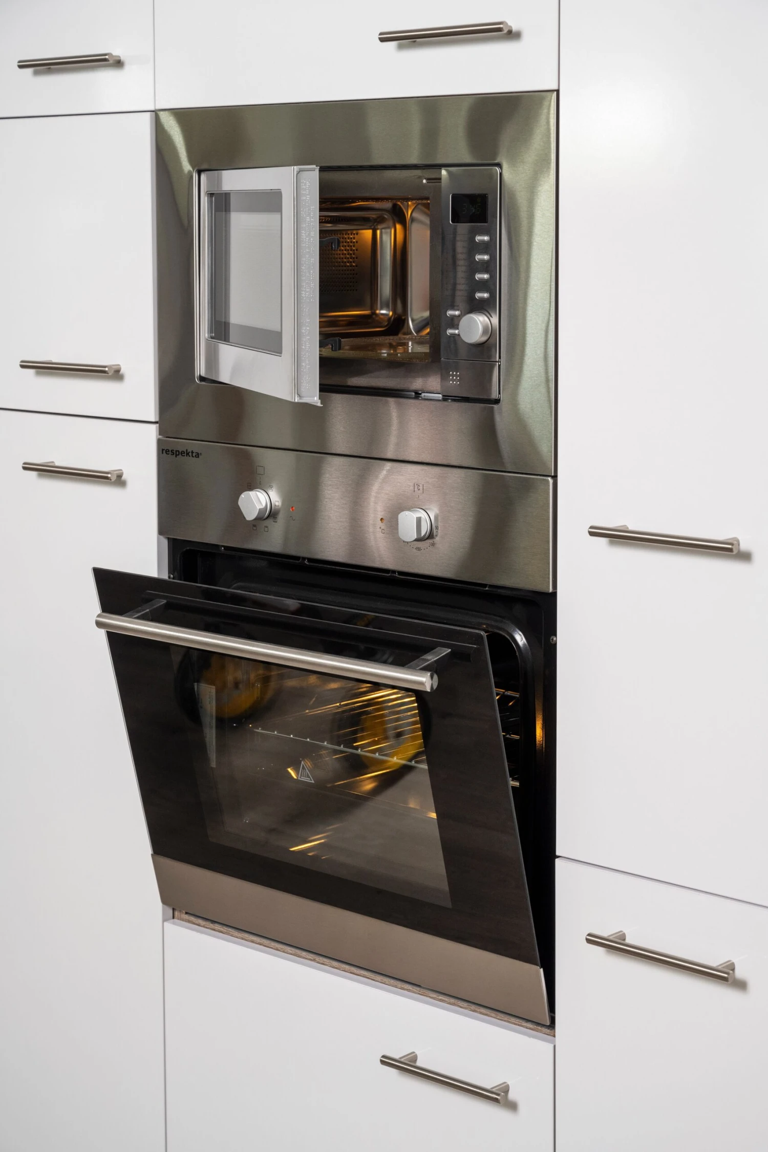 - Beheizungsarten 8: Auftauen, Ober- und Unterhitze, Ober-/Unterhitze und Umluft, Grill, Doppelgrill (Oberhitze mit Grill), Doppelgrill mit Umluft, Unterhitze mit Umluft, Eco Backofeninnentür Doppel-Verglasung Backofentür schwarzes Glas & Edelstahl, Griff Edelstahl
