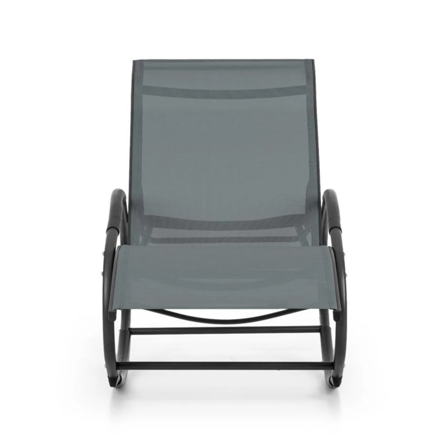 Der ovale Rahmen aus 30 mm dicken Aluminiumrohr der Blumfeldt Santorini Schaukelliege macht es mit seiner bequemen Sitz- und Liegefläche ganz einfach abzuschalten. Sanft wiegt er sich auf seinen ovalen Kufen hin und her. Die bequeme Liegefläche aus PVC und Polyester lädt zum Relaxen ein. Der Neigewinkel lässt sich kinderleicht 3-fach an der Rückseite verstellen, während Gummiüberzüge den Rahmen zu einer angenehmen Armablage verwandeln. Und egal wie stark der Schaukelstuhl wippt: 4 Sicherheitsstopper verhindern das Überkippen. Für lange Freude am Gartenmöbel sorgt die wasserabweisende Pulverbeschichtung am Rahmen und das witterungsbeständige, leicht abwischbare Kunststoffmaterial der Sitzfläche.