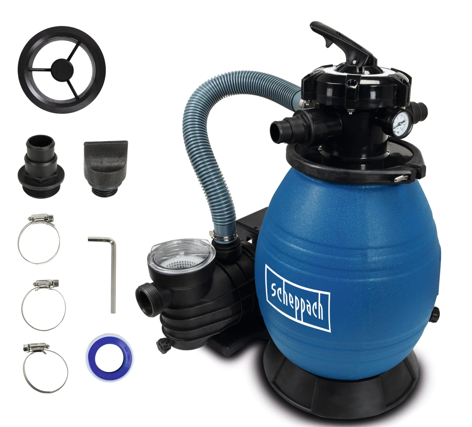 • Lieferumfang: Mehrwegeventil, Verriegelungsflansch, Manometer, Filterbehälter, Schwimmbadpumpe, Grundplatte, Anschlussset