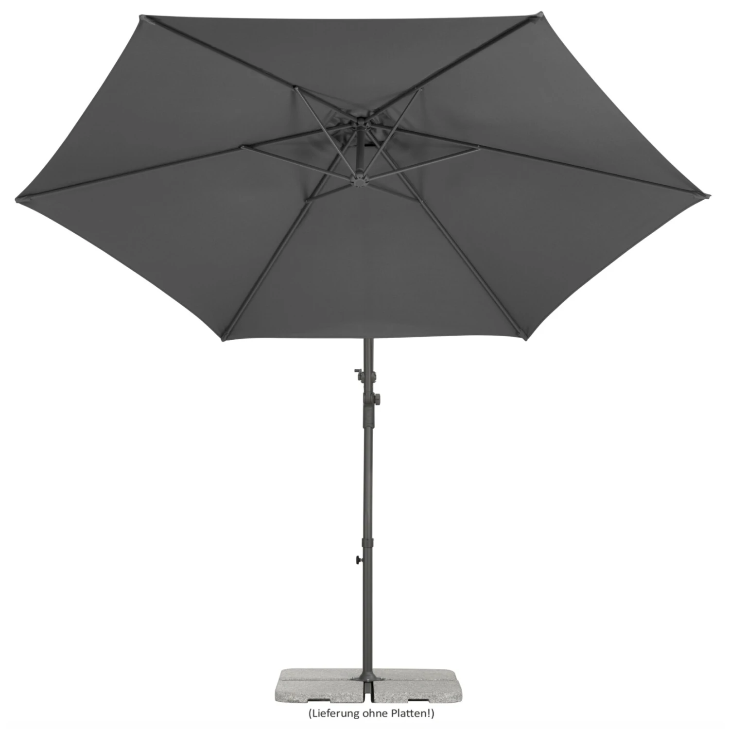 Im Lieferumfang enthalten ist ein Plattenständer für 4 Wegeplatten in der Größe 40 x 40 x 5 cm (Platten nicht enthalten), welcher dem Schirm einen sehr stabilen Halt gibt.