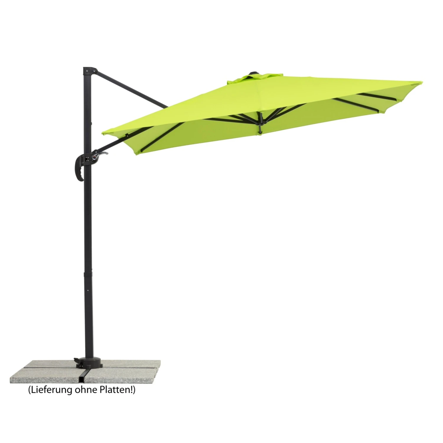 Im Lieferumfang enthalten ist ein Plattenständer für 4 Wegeplatten in der Größe 50 x 50 x 5 cm (Platten nicht enthalten), welcher dem Schirm einen sehr stabilen Halt gibt.