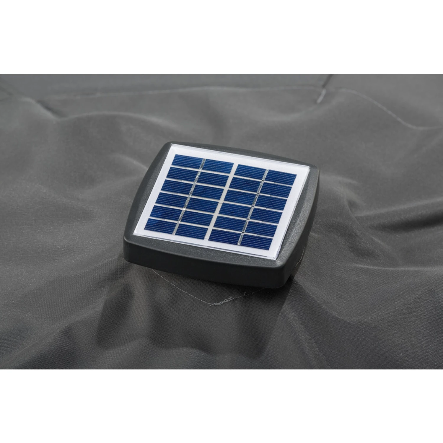 Er schützt Sie tagsüber nicht nur vor Sonneneinstrahlung, sondern bietet Nachts mit seinen LED-Leisten auch eine Lichtquelle. Das Solartop lädt sich tagsüber von alleine auf, sodass der Schirm in der Dunkelheit strahlt.
