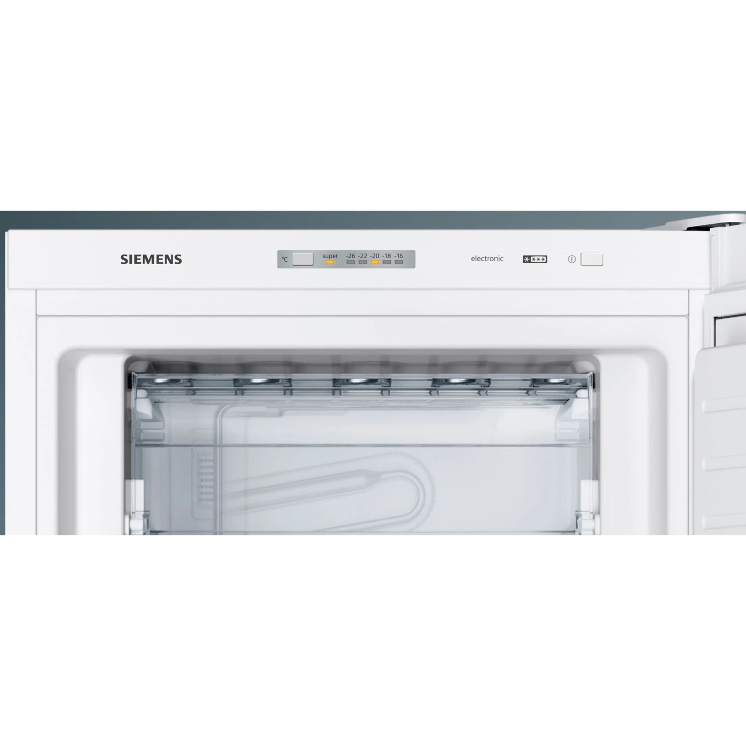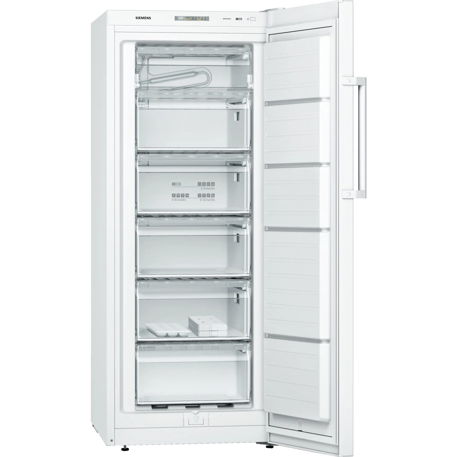 Der Gefrierschrank Siemens GS24VVWEV ist mit einem Gesamtnutzinhalt von 182 Litern ideal für den mittelgroßen Haushalt geeignet. Er stellt fünf transparente Gefrierschubladen sowie ein Gefrierfach mit Klappe für Gefriergut zur Verfügung. freshSense sorgt für eine konstante Temperatur durch intelligente Sensortechnik und die SuperGefrieren-Fuktion senkt für einen definierten Zeitraum die Temperatur zum schnelleren Einfrieren von neu eingelagerten Lebensmitteln. Die Temperaturregelung des GS24VVWEV erfolgt elektronisch und ist über LED ablesbar.