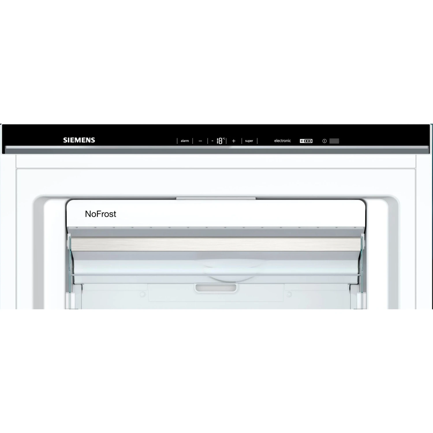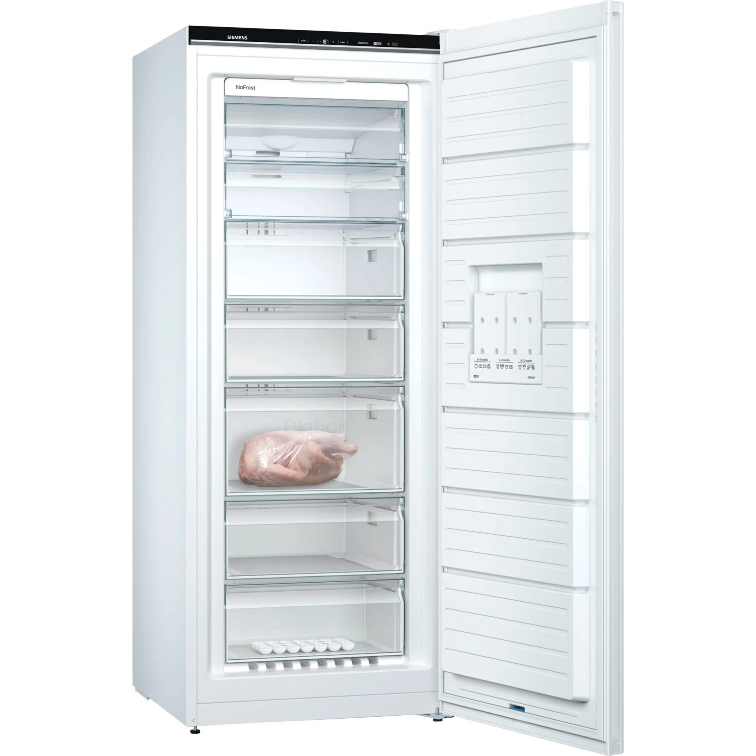 Der Gefrierschrank Siemens GS54NUWDV bietet einen Gesamtnutzinhalt von 328 Litern und jede Menge Komfort. Neben zwei Intensiv-Gefrierfächer mit Glasablagen und transparenter Klappe ist er mit fünf transparenten Gefrierschubladen, davon eine bigBox zum Stapeln von Einfrierbehältern oder für großes Gefriergut, ausgestattet. Dank varioZone lassen sich Schubladen und Glasablagen problemlos neu anordnen, um den Raum im Gefrierschrank flexibel zu gestalten. Mit der noFrost-Technologie wird mühsames Abtauen überflüssig und das MultiAirflow-System sorgt für optimale und gleichmäßige Kälteverteilung. freshSense ermöglicht eine konstante Temperatur durch intelligente Sensortechnik und die SuperGefrieren-Funktion schützt bereits Gefrorenes beim Einlegen frischer Lebensmittel vor dem Antauen. Mit einem Stromverbrauch von 212 kWh im Jahr ist der GS54NUWDV in die Energieeffizienzklasse D eingestuft.