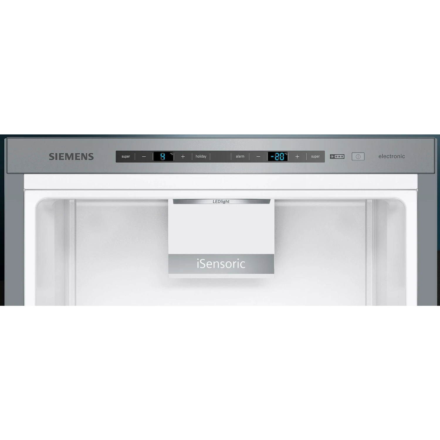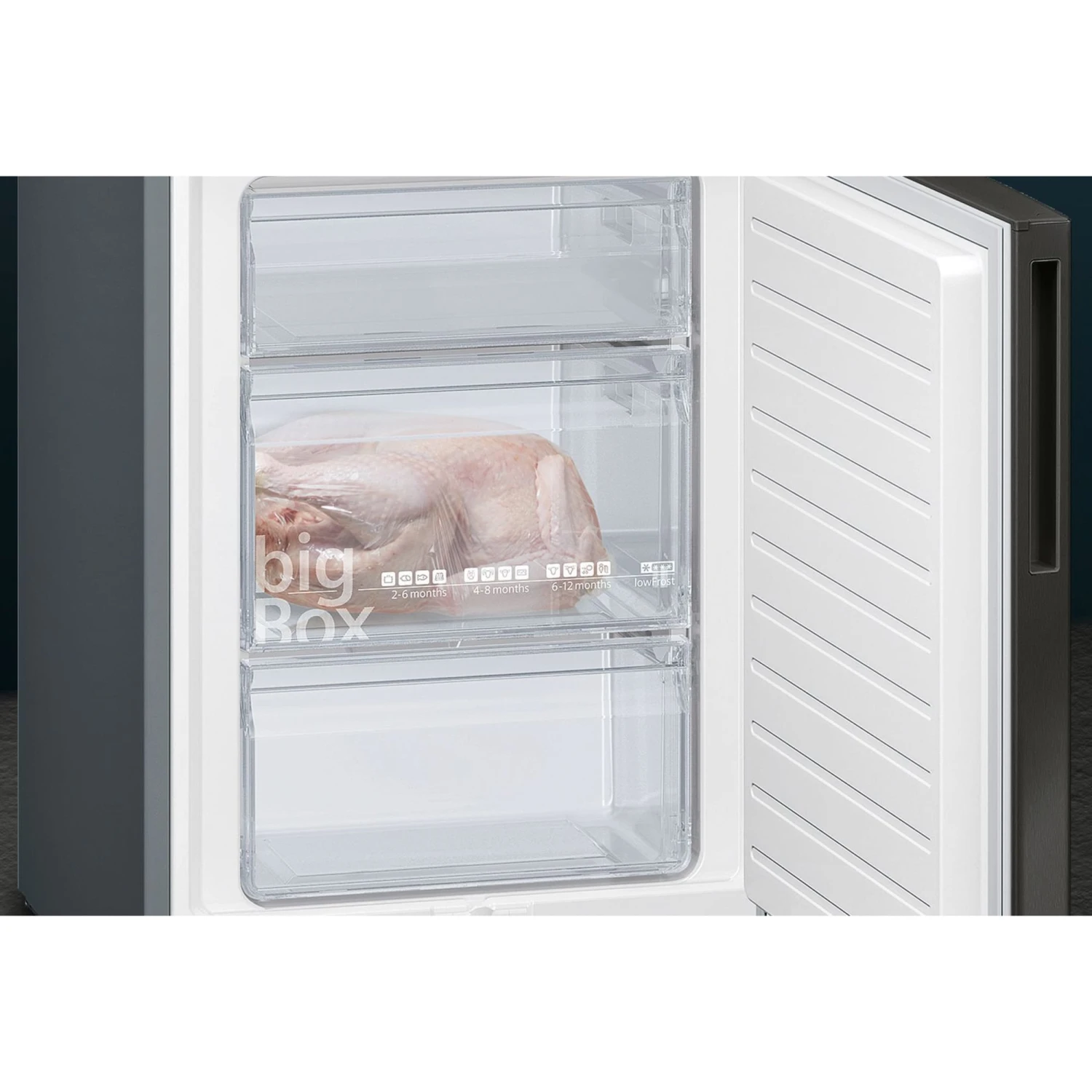 Die Kühl-/Gefrierkombination Siemens KG39E8XBA ist mit einem Gesamtnutzinhalt von 343 Litern ideal für den mittelgroßen Haushalt geeignet. Im 249 Liter umfassenden Kühlbereich haben frische Lebensmittel auf fünf Abstellflächen aus Sicherheitsglas, davon zwei höhenverstell- und vier ausziehbar, in einer hyperFresh Obst-/Gemüseschublade mit Feuchteregelung und einer hyperFresh 0°C Box für Fisch und Fleisch sowie in vier Türfächern jede Menge Platz um übersichtlich gelagert zu werden. Mit der Taste superCooling werden die Temperaturen im Kühlraum schnell auf +2 °C gesenkt, was beim Einlagern von wärmeren Lebensmitteln in den Kühlraum einen unerwünschten Temperaturanstieg bereits gut gekühlter Speisen verhindert. Der Gefrierbereich der KG39E8XBA umfasst 94 Liter und ist mit drei transparenten Gefriergutschubladen, davon eine BigBox, ausgestattet. LowFrost reduziert die Eisbildung, sodass man den Gefrierraum deutlich seltener abtauen muss. Die Temperaturregelung der KG39E8XBA erfolgt getrennt für Kühl- und Gefrierbereich und ist digital exakt ablesbar. Mit einem Stromverbrauch von 119 kWh im Jahr ist die KG39E8XBA in die Energieeffizienzklasse B eingestuft.