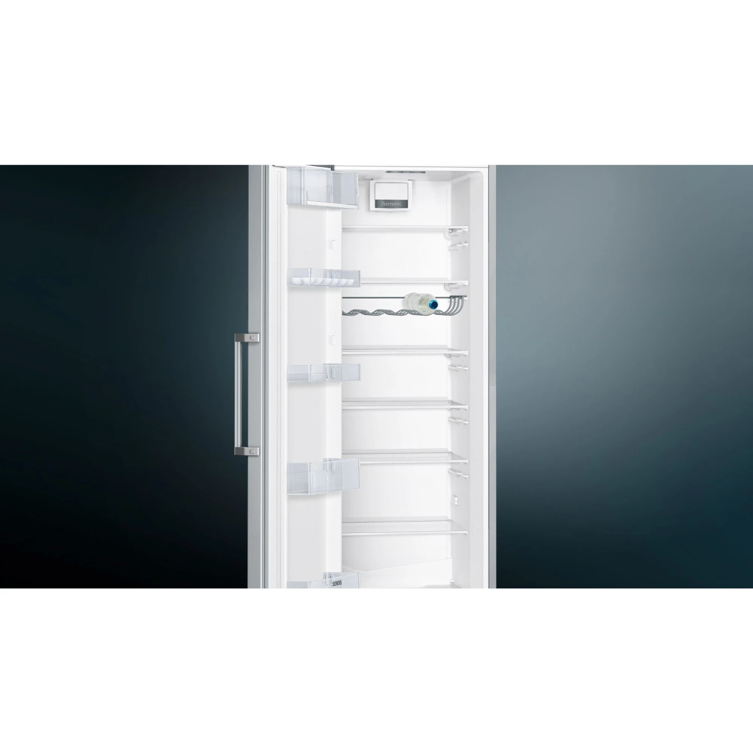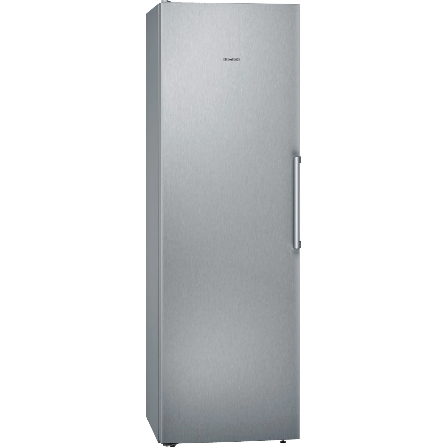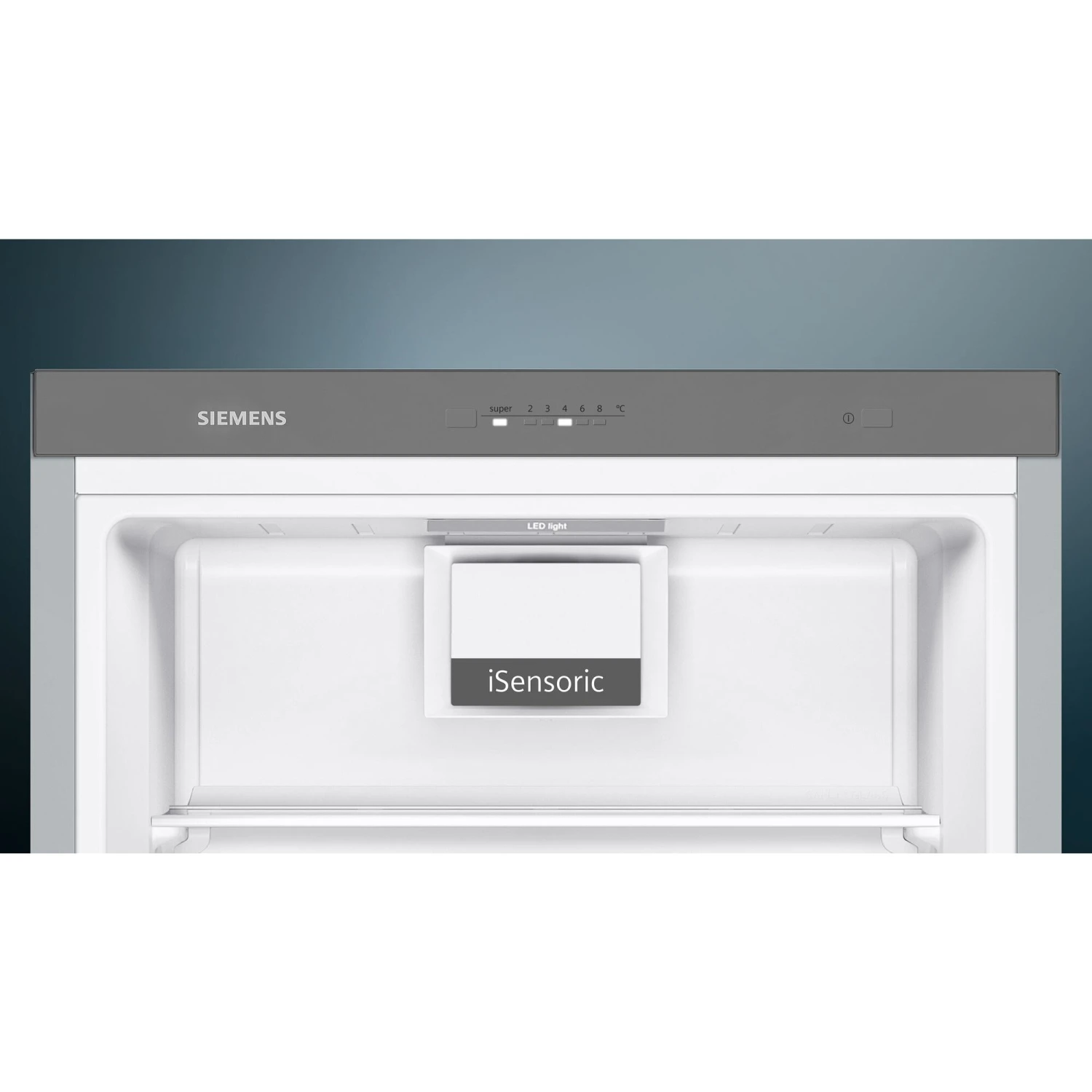 Der Kühlschrank Siemens KS36VVIEP stellt einen großzügigen Gesamtnutzinhalt von 346 Litern zur übersichtlichen Lagerung frischer Lebensmittel zur Verfügung. Ausgestattet ist er mit sieben Abstellflächen aus Sicherheitsglas, davon fünf höhenverstell- und sechs ausziehbar, sowie einem verchromten Flaschenrost und fünf Türfächern, davon ein Butter-/Käsefach. In der hyperFresh Box mit Feuchteregelung bleibt Obst und Gemüse länger frisch und knackig. Die intelligente Sensortechnik FreshSense sorgt im gesamten Kühlraum für eine konstante Temperatur und mit der SuperKühlen-Funktion wird die Temperatur für eine eingestellte Zeit gesenkt, sodass beim Einlagern wärmerer Lebensmittel ein unerwünschter Temperaturanstieg bereits gekühlter Speisen verhindert wird. Mit einem Stromverbrauch von 116 kWh im Jahr ist der KS36VVIEP in die Energieeffizienzklasse E eingestuft.