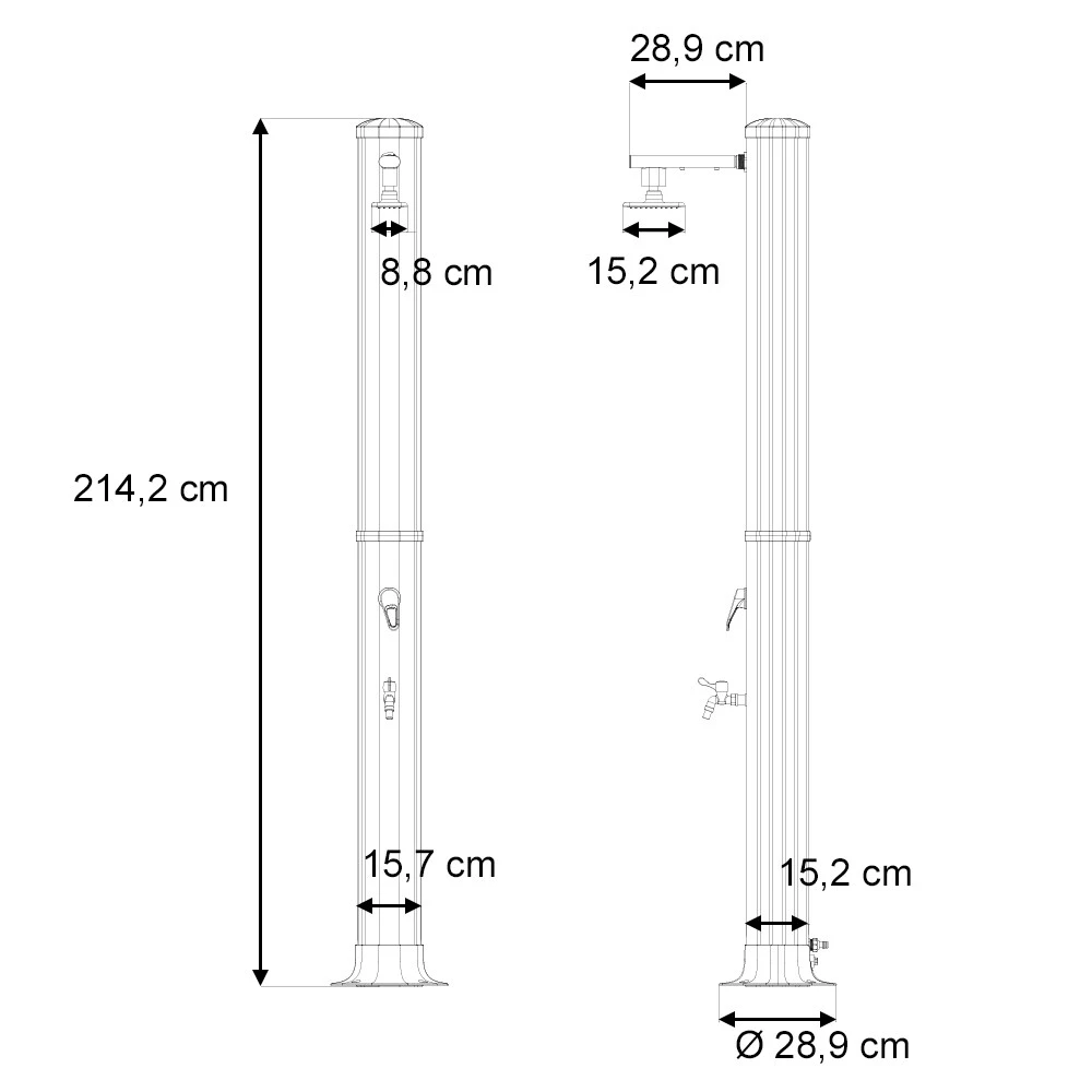 • Die Solardusche hat einen schwenkbaren, großen Regenduschkopf verbaut und der robuste Standfuß macht sie sehr stabil.