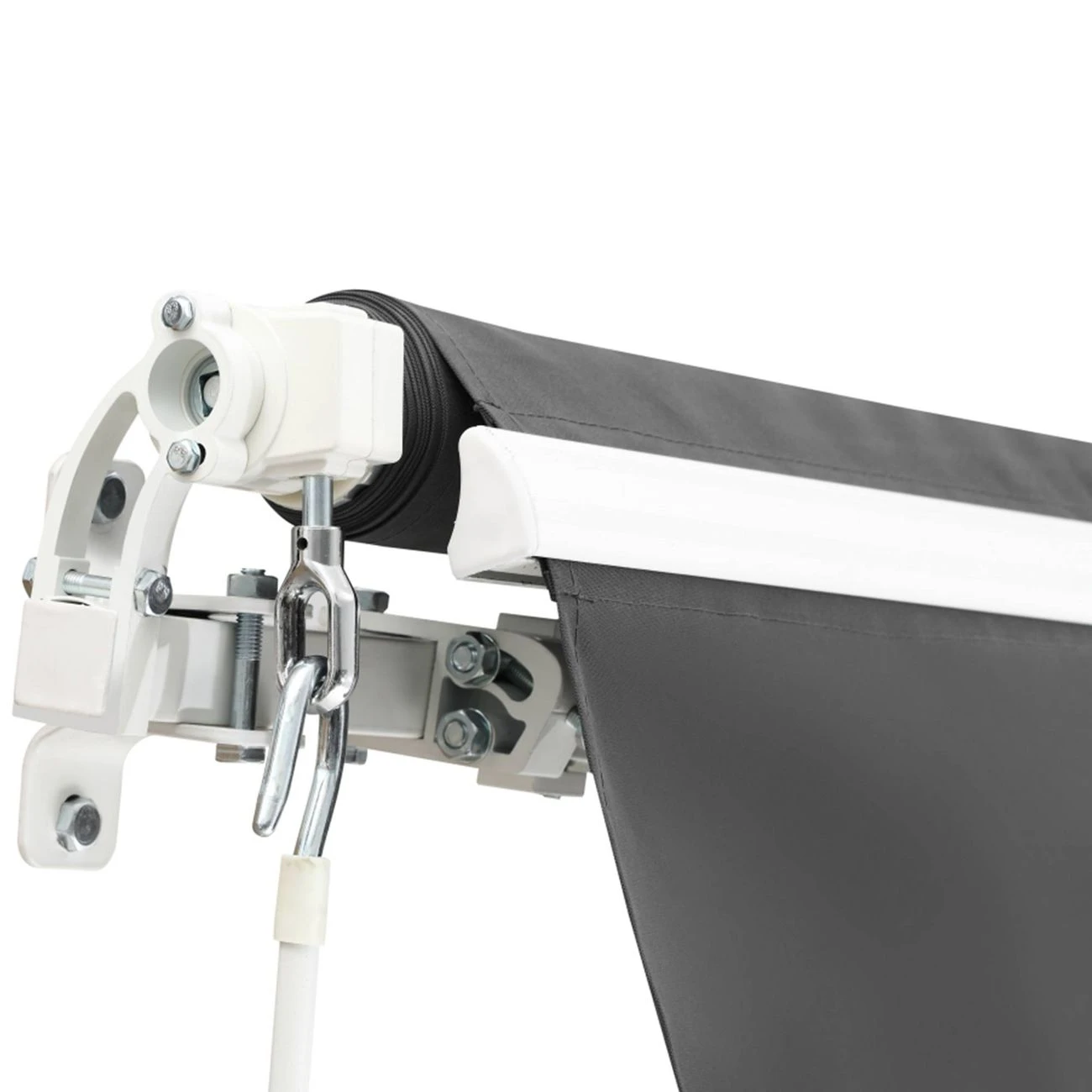 Da die Markise im Freien stets Wind und Wetter ausgesetzt ist, bietet sie eine hohe Stabilität und ist aus robusten Materialien gefertigt. Die Gelenkarme und Befestigungselemente präsentieren sich aus solidem Stahl und Aluminium – der optisch ausgesprochen elegante Stoff aus strapazierfähigem Polyester. Dieser ist wasserdicht sowie UV-beständig, während die Gelenkarme auch etwas kräftigerem Wind hervorragend standhalten.