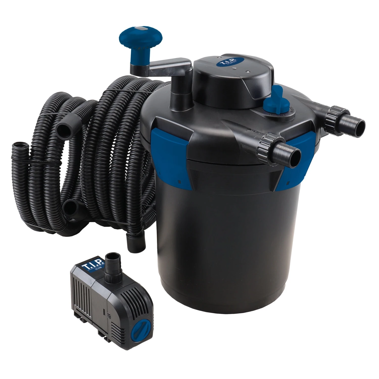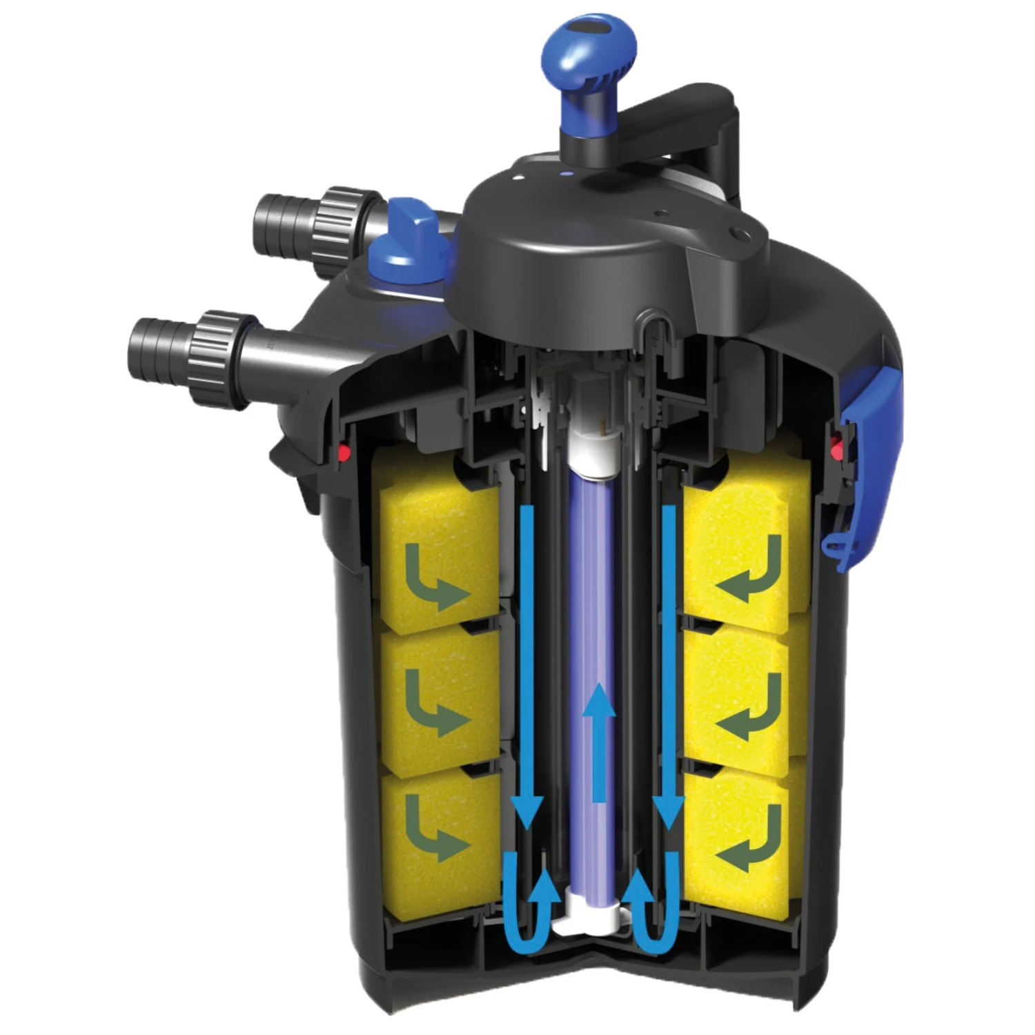 Teichdruckfilter mit UV-C Strahler, Pumpe und 8-Liter Druckbehälter. Mit 9 Watt UV-C Strahler, Funktionswahlschalter, allen Filtermaterialien, Schlauch und allen Anschlüssen. Inklusive leistungsstarker Filterpumpe. Der Filterkopf ist mit einem Funktionswahlschalter ausgestattet der durch einfaches Drehen die Filter- bzw. Rückspülfunktion aktiviert. Die Reinigung ist dadurch ohne Öffnen des Filters und ohne Veränderung der Installation möglich. Im Filtersystem herrscht während des Betriebes Überdruck. Die Wirksamkeit der einzelnen Filterstufen wird dadurch im Vergleich zu herkömmlichen Außenfiltern deutlich erhöht. Für Teiche bis 5.000 Liter.