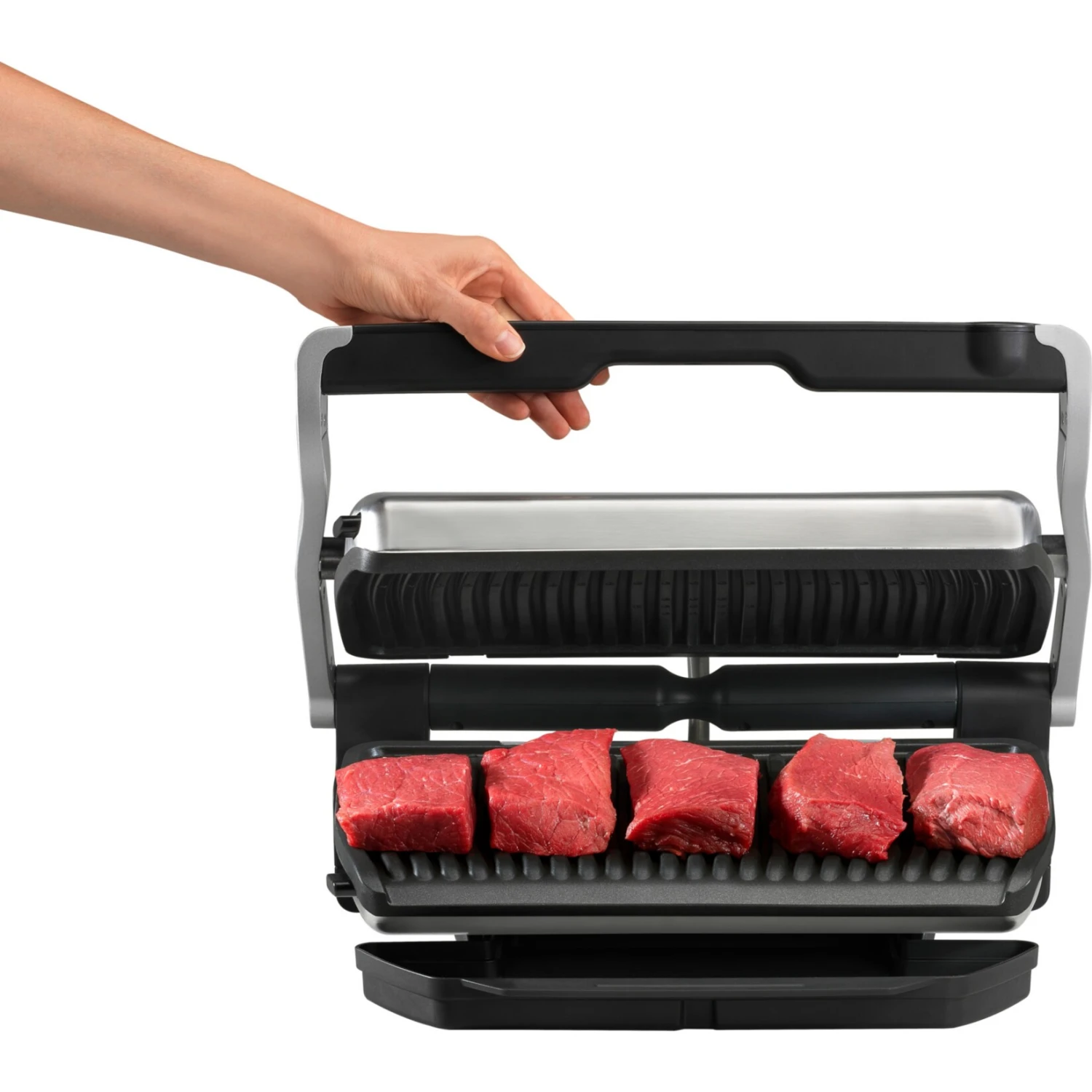 Bei der Innovation von Tefal, dem OptiGrill+ XL, sorgt intelligente Technologie für köstliche Garergebnisse. Mit einer großen Grillfläche für sechs bis acht Personen ist er ideal zum Grillen mit Familie und Freunden. Inklusive der Technologie „Automatic Sensor Cooking“: Garzeit und -temperatur werden auf Grundlage von 9 Garprogrammen (Burger, Steaks, Sandwiches, Würstchen, Fisch, Geflügel, Meeresfrüchte, Schweinefleisch und Bacon) automatisch je nach Dicke und Menge des Grillguts reguliert. Zusätzlich gibt es einen Modus zum Auftauen von Gefriergut. Eine direkte Überwachung ist über den Lichtindikator möglich: Violett für Vorwärmen, blau, dann grün zum Garbeginn, gelb, wenn das Grillgut blutig gebraten ist, orange für medium und rot für durchgebraten. Auf den Punkt für jeden Geschmack! Einfach den Deckel anheben und das Fleisch herausnehmen, wenn es fertig ist. Der Rest kann weiter garen! Mit dem zusätzlichen manuellen Modus mit 4 regulierbaren Temperaturen kann man verschiedenste Lebensmittel, Früchte und Gemüse, genau so zubereiten, wie es einem schmeckt. Bei diesem Modell ist die Menüsprache Deutsch evtl. nicht einstellbar.