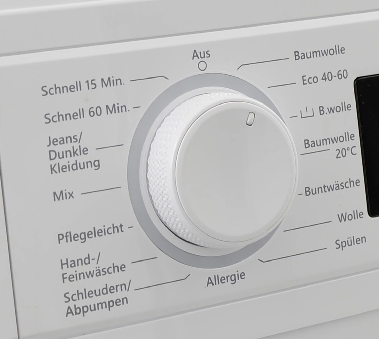 - Programme: Eco 40-60° – Baumwolle mit Vorwäsche – Baumwolle 90° – Baumwolle 60° – Baumwolle 20° – Buntwäsche 40° – Pflegeleicht (Synthetik) – Wolle – Spülen – Mix – Schleudern – Hand-/Feinwäsche –