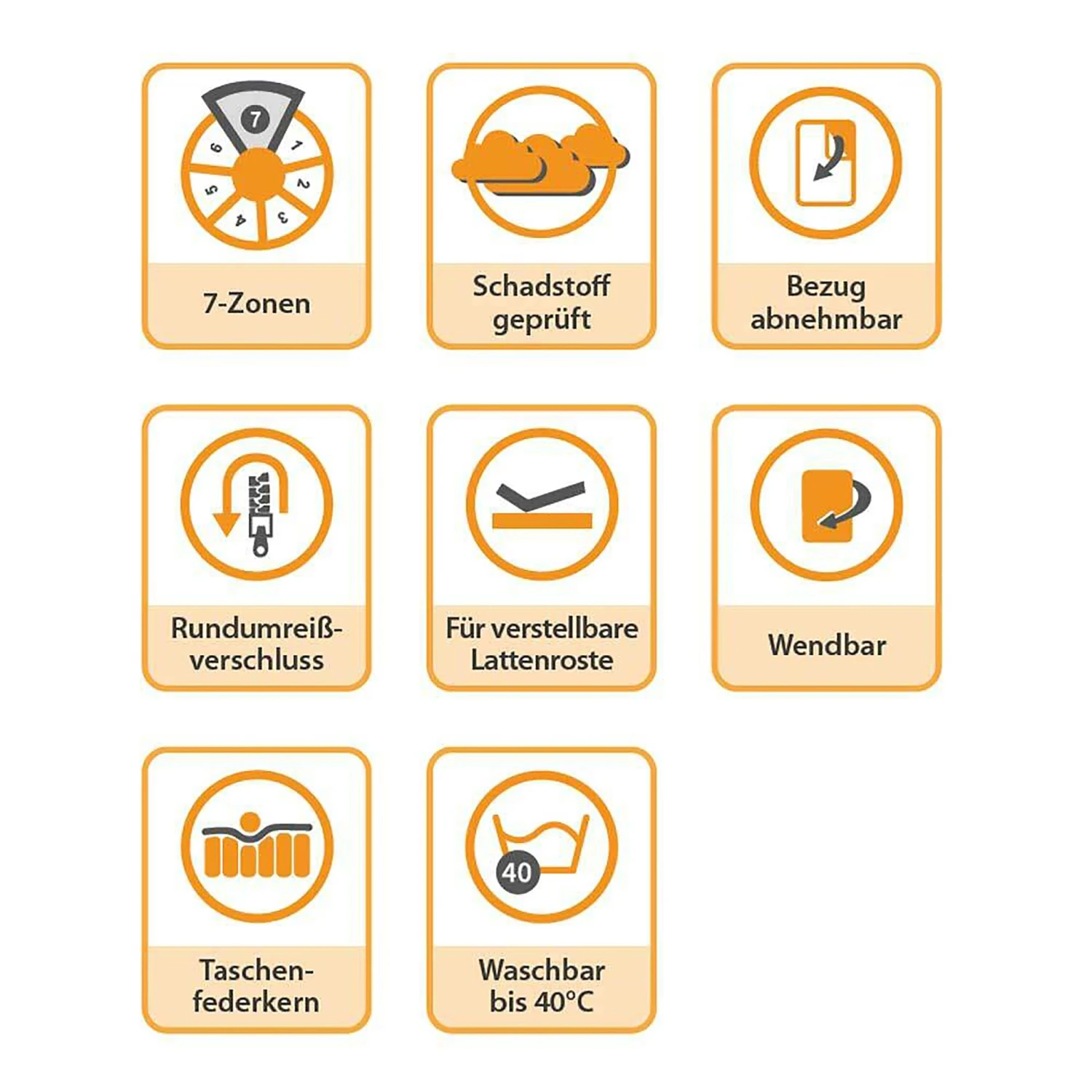 - Matratzenkern: 7-Zonen Taschenfederkern, mit 262 Federn/m², einzeln in Taschen gelagert