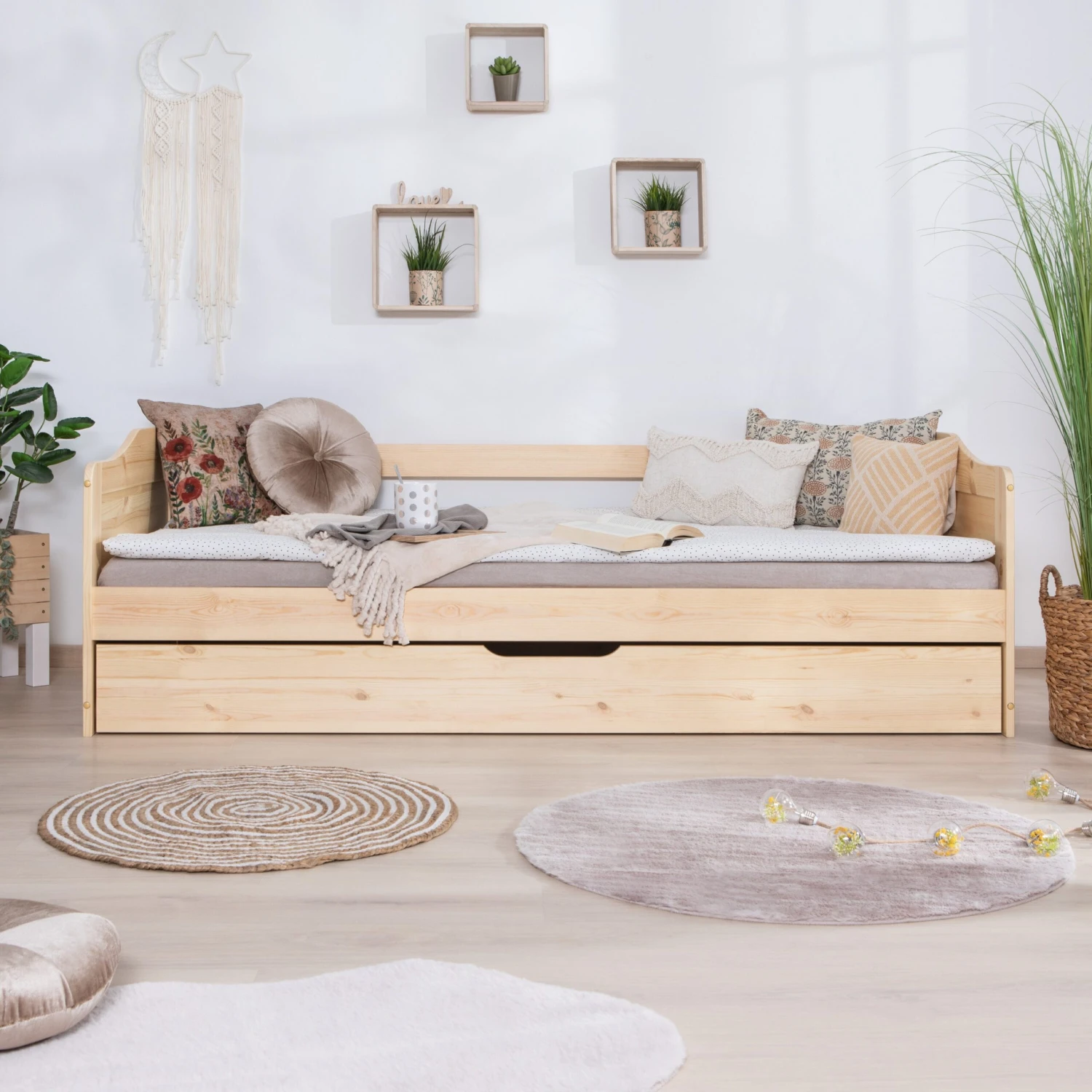 Mit diesem praktischen und ansehnlichen Funktionsbett „Melinda“ sind Sie auch auf spontanen Besuch immer vorbereitet. Im Auszug versteckt sich eine weitere Liegefläche, die ganz bequem herausgezogen werden kann und so einen weiteren gemütlichen Schlafplatz schafft. Das Bett wurde aus massiver Kiefer gefertigt und kann dadurch durch hohe Stabilität und Standfestigkeit überzeugen. Auch in anderen Farben erhältlich!