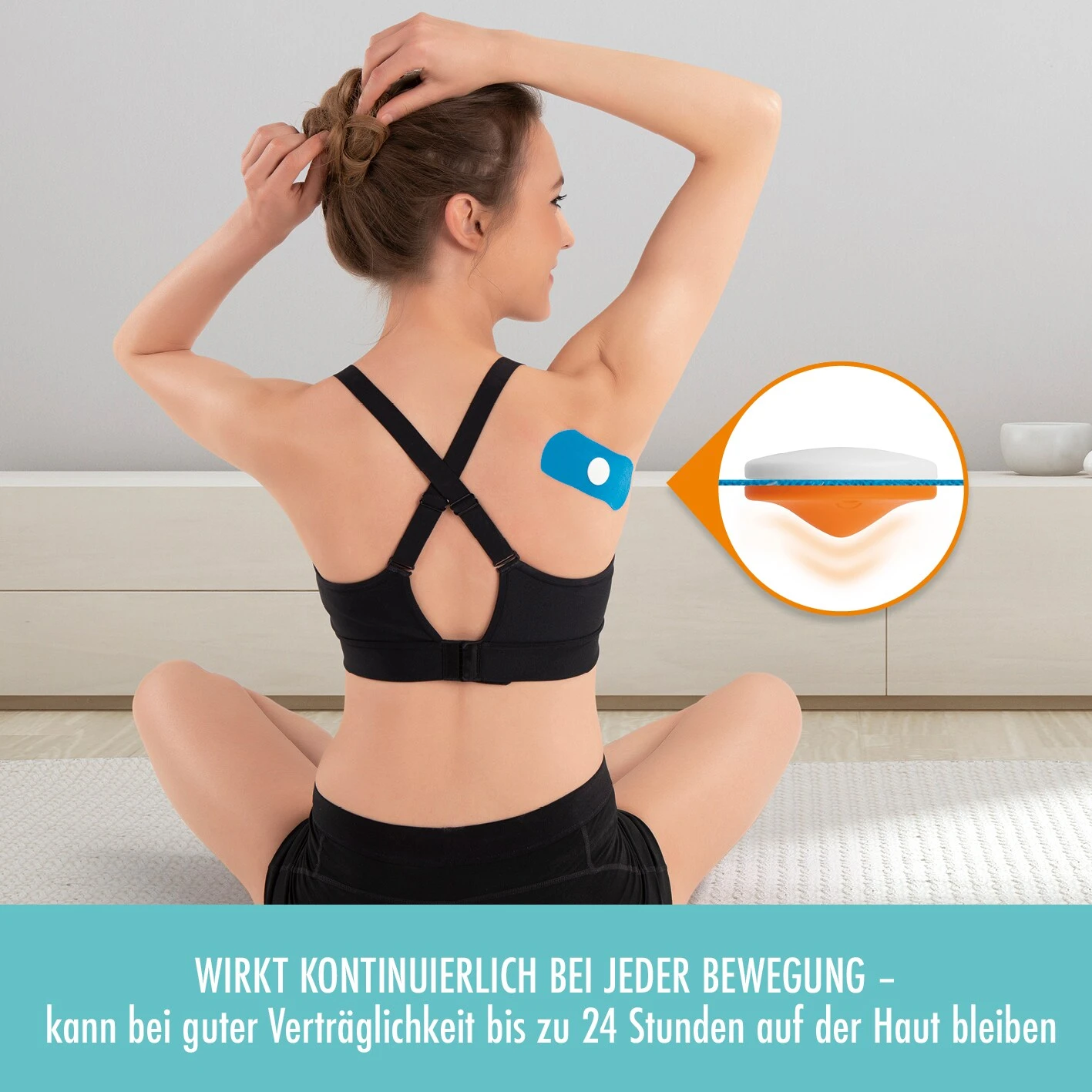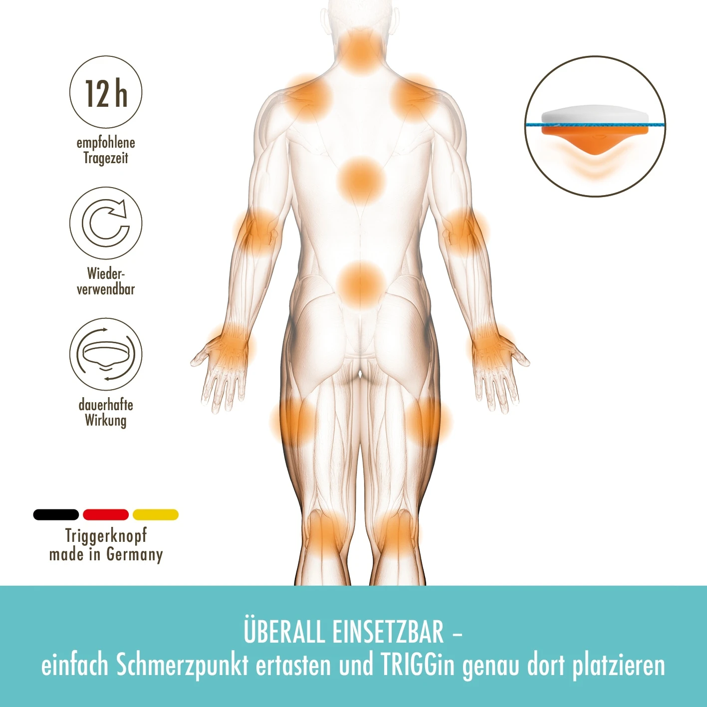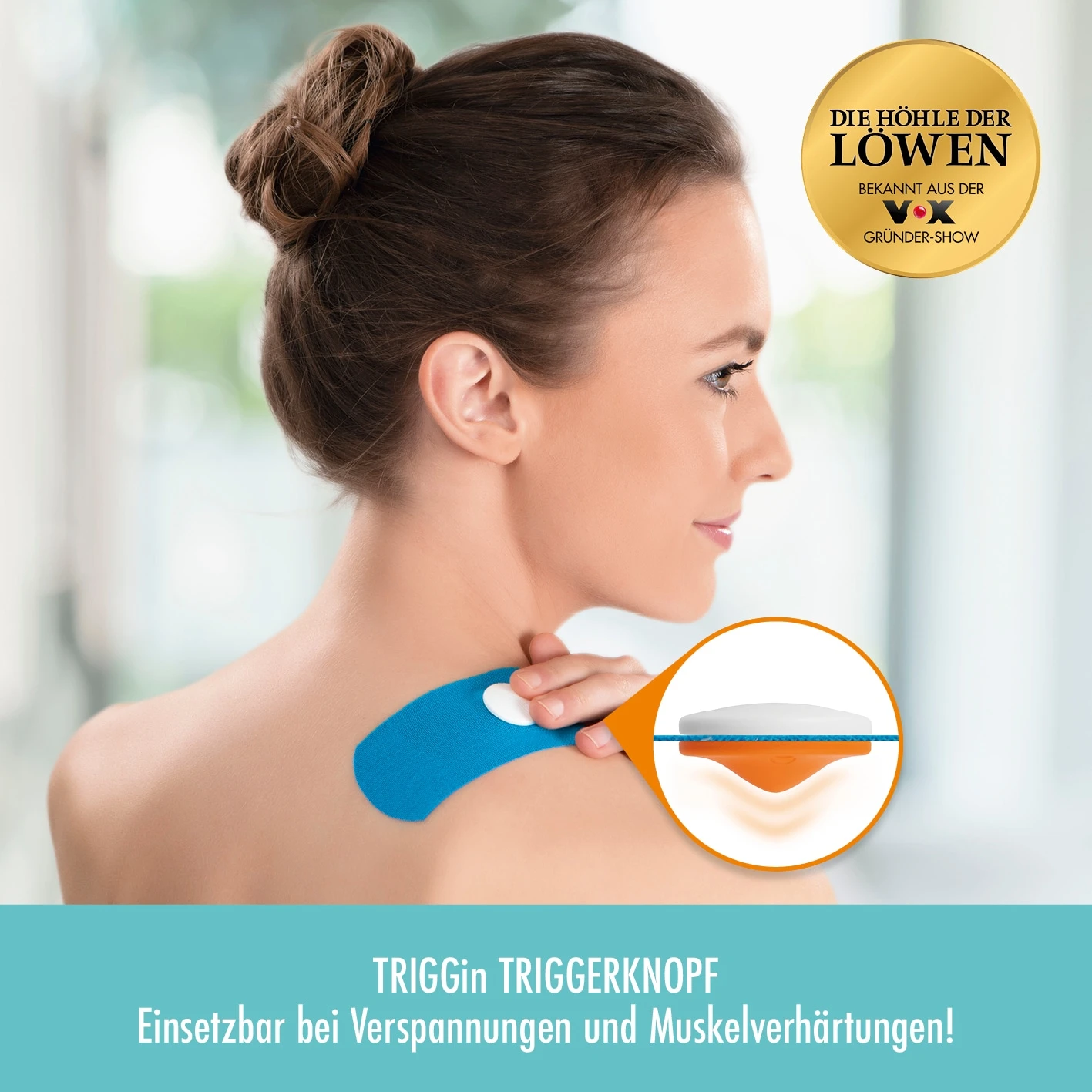 Sicherlich kennen Sie das befreiende Gefühl, wenn der Physiotherapeut den Schmerzpunkt findet und löst. Der TRIGGin Triggerknopf kann Schmerzen ebenfalls auf den Punkt lindern und bis zu 24 Stunden auf der Haut bleiben. Der entscheidende Vorteil besteht darin, dass während der gesamten Tragezeit ein Reiz auf den schmerzhaften Triggerpunkt ausgeübt wird – und eben nicht nur während einer z. B. 20-minütigen Massage. Der kleine Knopf wirkt immer und überall – und so einfach geht´s: Als erstes ertasten Sie den Schmerzpunkt, also die Verspannung/Verhärtung im Muskel. Dann platzieren Sie den TRIGGin Triggerknopf, fixieren ihn mit dem mitgelieferten Tape und lassen ihn wirken, während Sie Ihren ganz normalen Beschäftigungen nachgehen. Der ständige, punktuelle Druck kann Verspannungen und Verhärtungen lösen und dazu führen, dass Sie sich im Alltag und beim Sport wieder besser, freier und länger ohne Schmerzen bewegen können. Anschließend lässt sich TRIGGin ganz einfach reinigen und wiederverwenden. Ideal für die Anwendung an Arm/Ellbogen, Nacken/Schulter und Beinen.