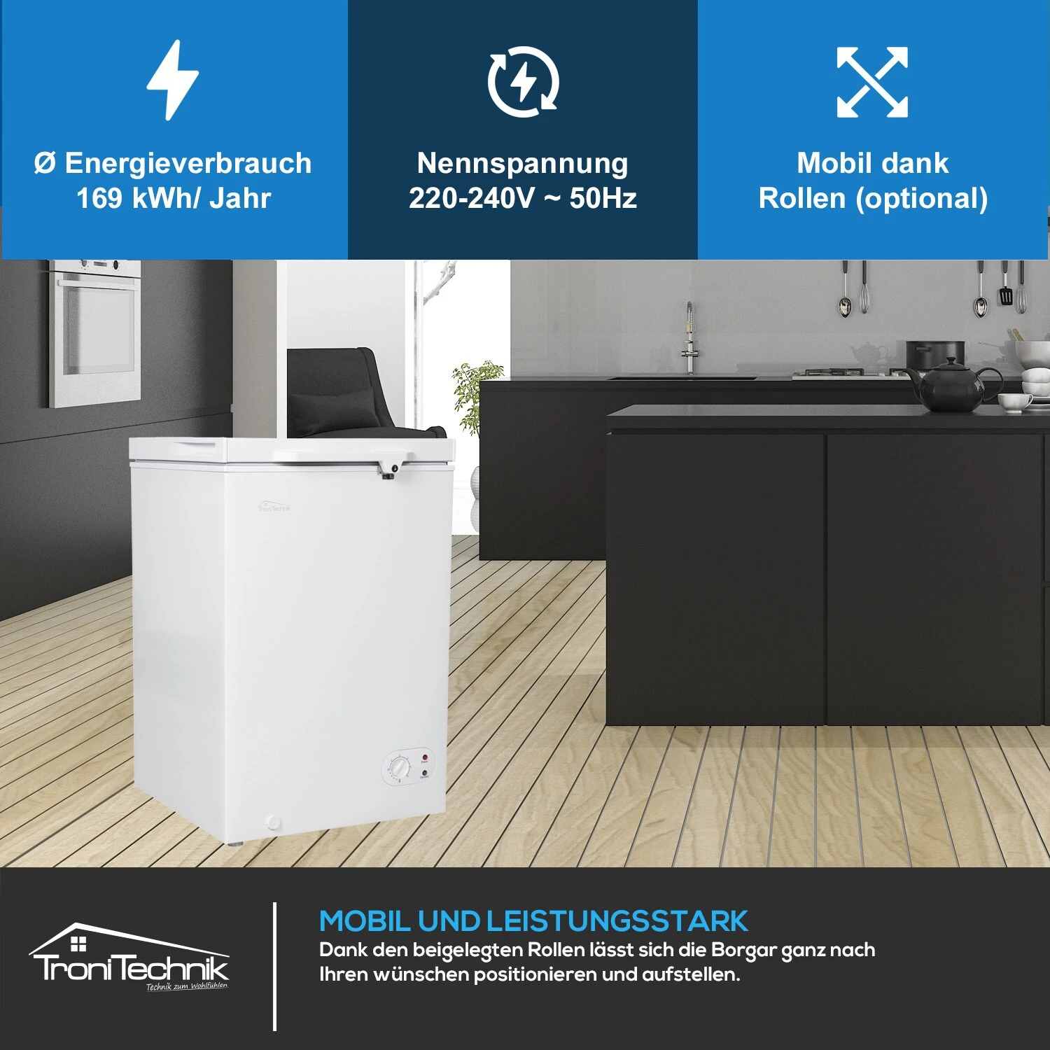 Bitte beachten Sie die technischen Daten für die entsprechende Größe der gewählten Tiefkühltruhe.