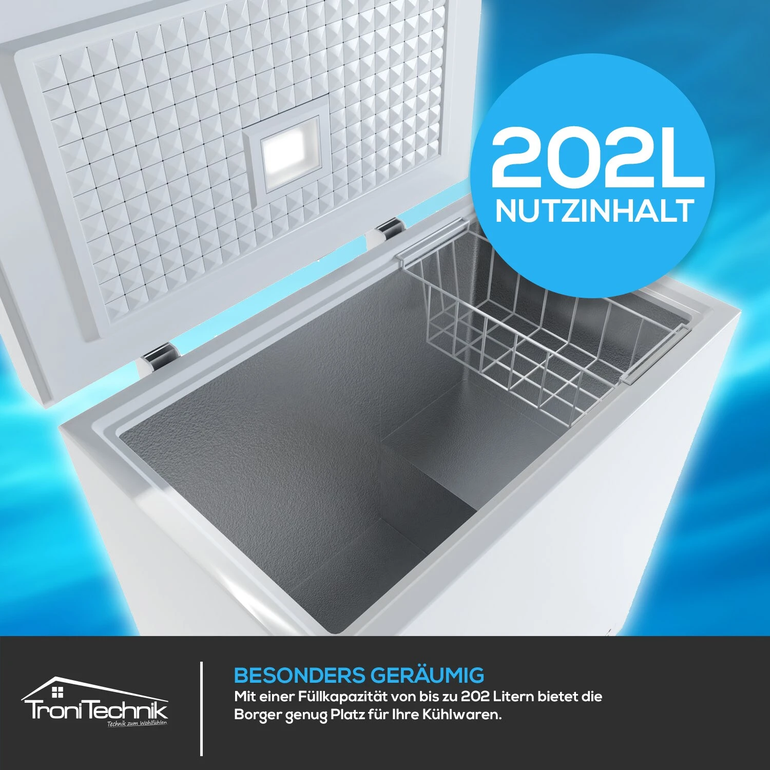 Holen Sie sich unsere moderne Gefriertruhe in Ihr Zuhause. Die Borgar-Reihe bietet Ihnen ausreichenden Nutzinhalt für jeden Verwendungszweck. Der im Lieferumfang enthaltene Korb vereinfacht den Zugriff auf kleinere Güter, welche Sie einfrieren möchten. Durch die direkte Kühlung und ein effizientes Kühlungsprinzip können Sie Speisen oder Getränke rasch und platzsparend kühlen oder gefrieren.