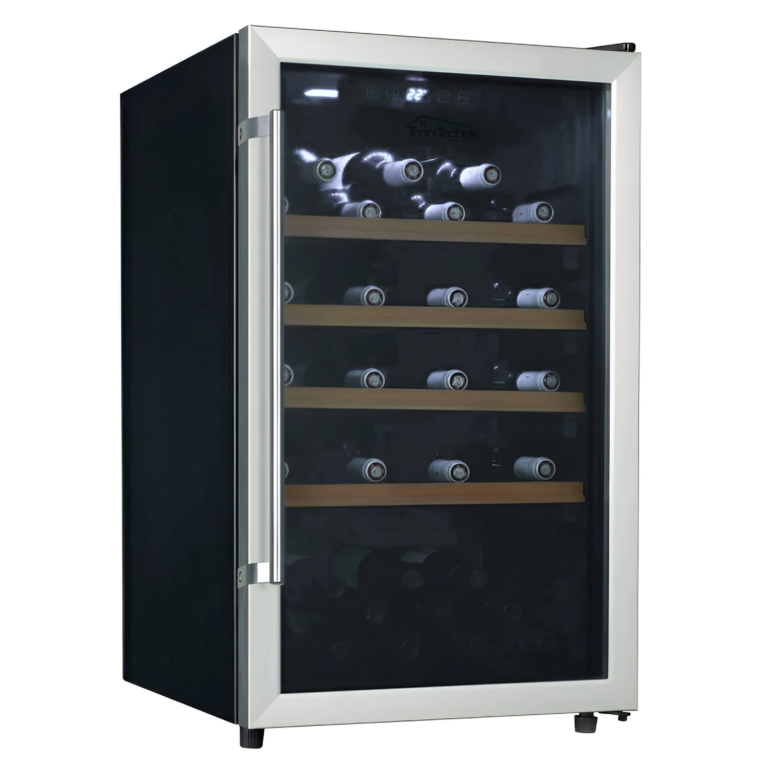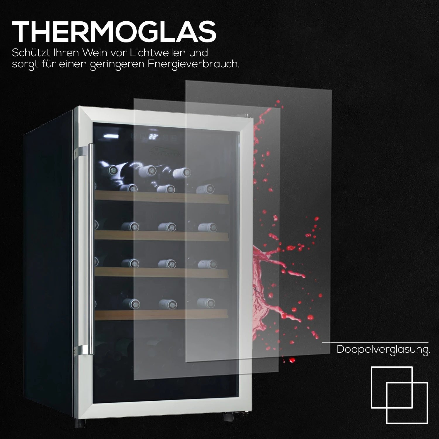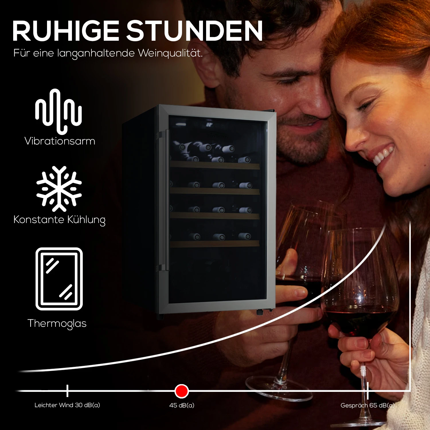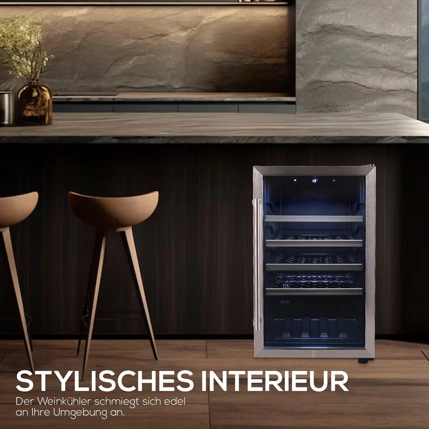 Dieser elegante Weinkühlschrank in einem schlichten Schwarz zeugt von einem verbesserten Gesamteindruck dank des Panoramafensters im Frontbereich. Hervorgehoben wird dieses luxuriöse Erscheinungsbild durch den silbernen Aluminiumrahmen und dem integrierten LED-Licht im Innenraum des Weinkühlers. So wird der gesamte Innenraum in einem angenehmen Blauton ausgestrahlt.