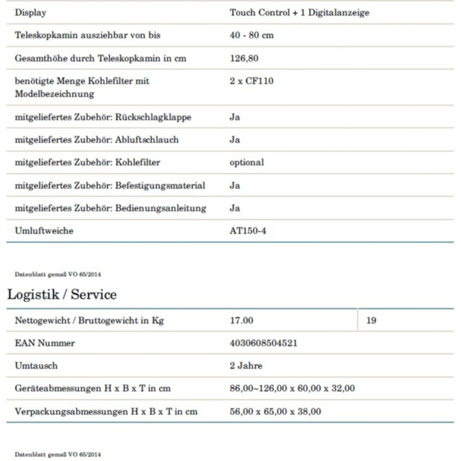 Gesamthöhe durch Teleskopkamin: 126,80 cm