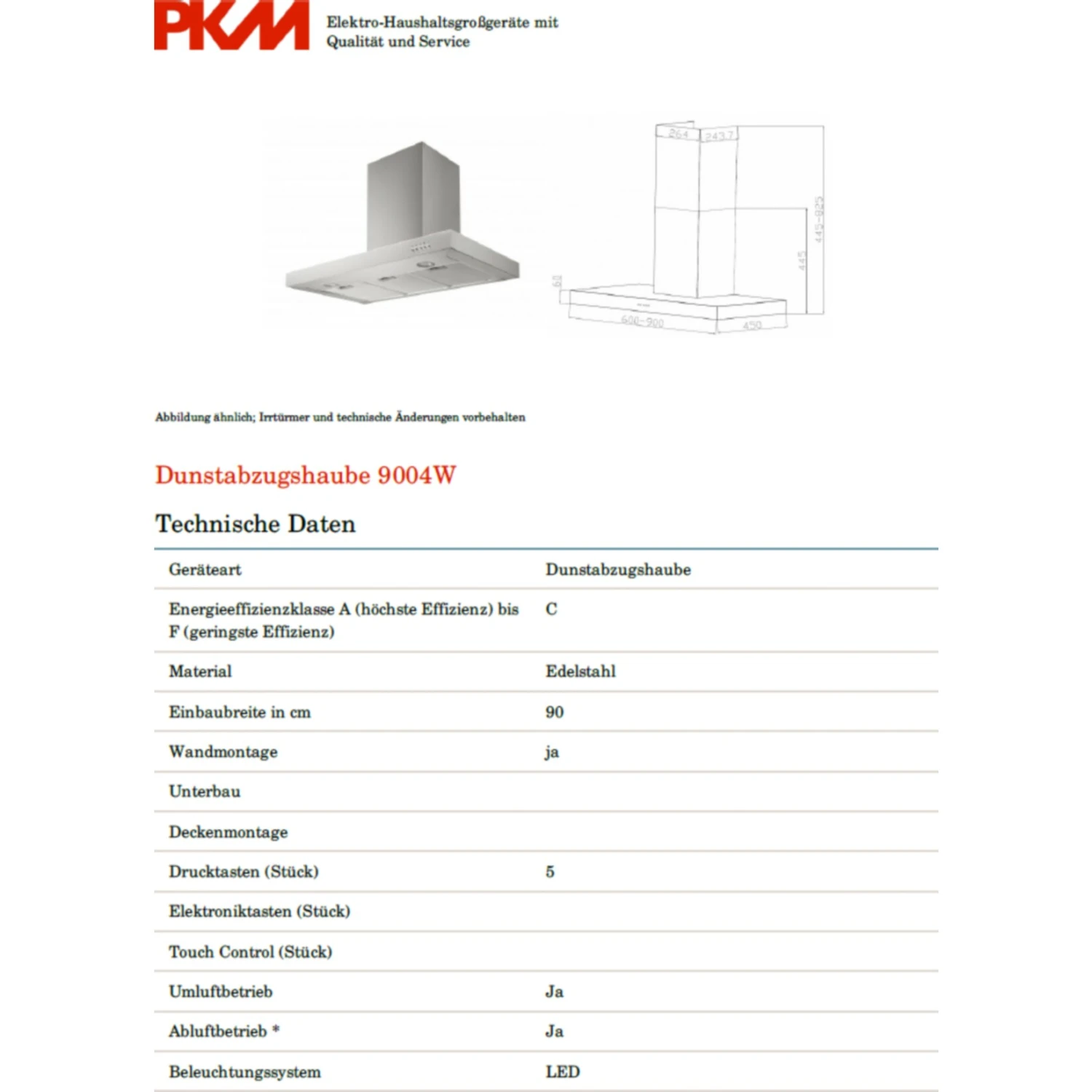 PKM 9004W Dunstabzugshaube 90cm Edelstahl LED Kaminhaube + Aktivkohlefilter CF150