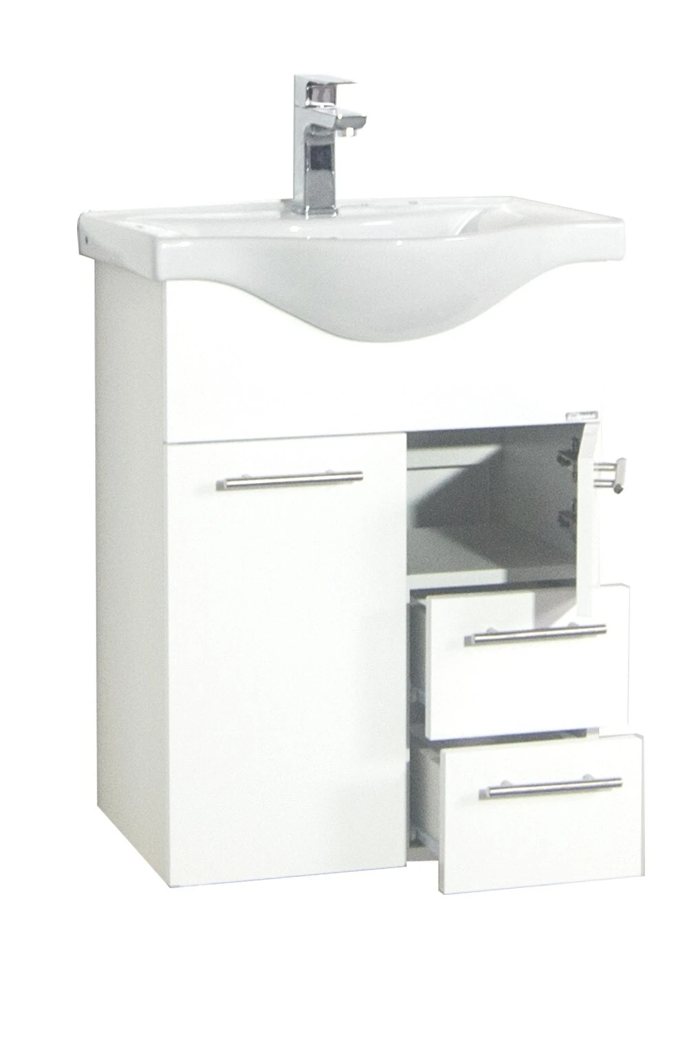 Das VCM Badmöbel-Set „Lisalo“ besteht aus einem Unterschrank und einem Waschbecken aus massiver Keramik. Der Designer hat sich bewusst für ein gewölbtes Waschbecken entschieden, da es den Komfort erhöht. Der Unterschrank hat zwei große Drehtüren und bietet praktischen Stauraum.