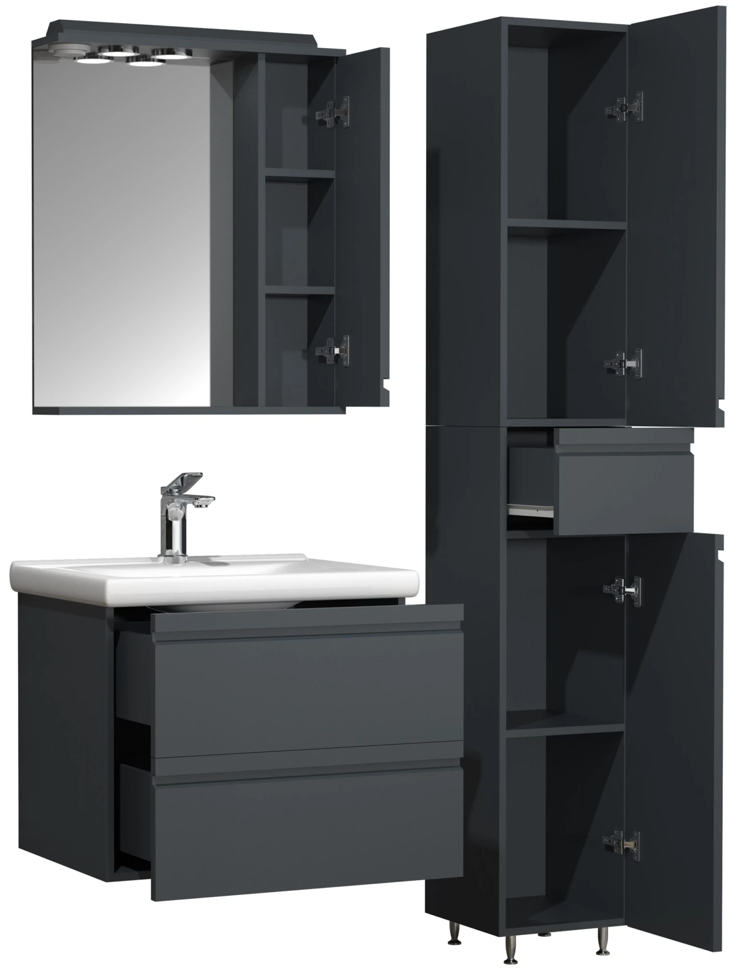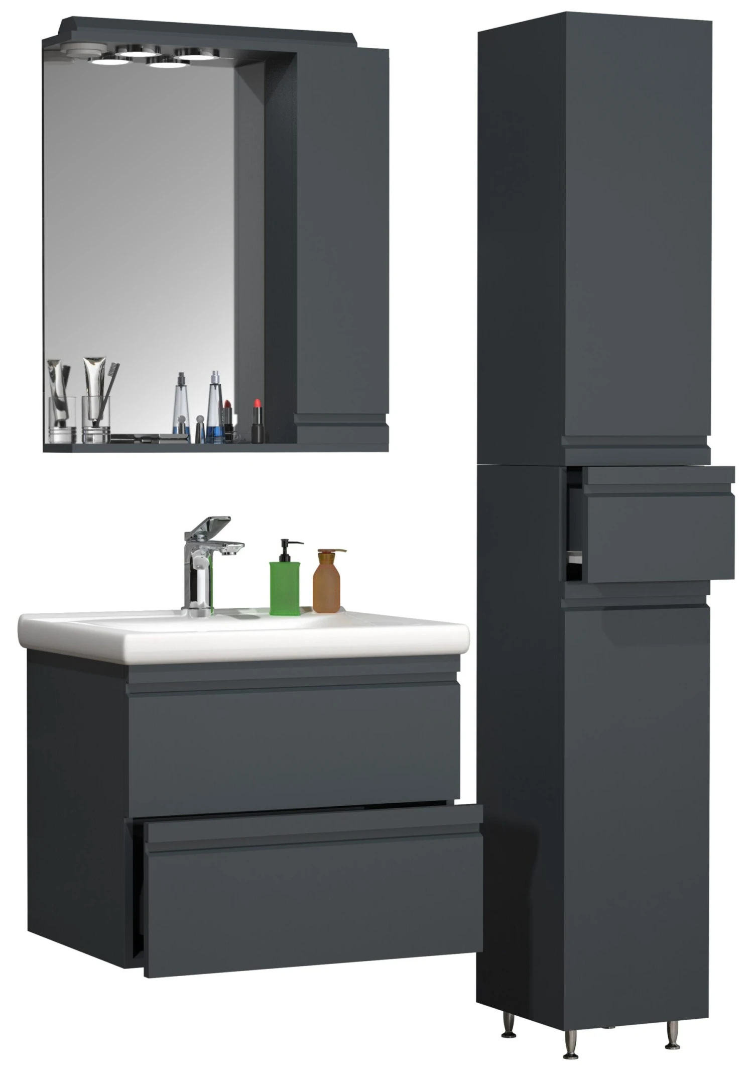 Das VCM Badmöbel-Set „Silora“ besteht aus einem Unterschrank mit zwei Schubladen und einem Waschbecken aus massiver Keramik, sowie einem Spiegelschrank und einem Hochschrank.