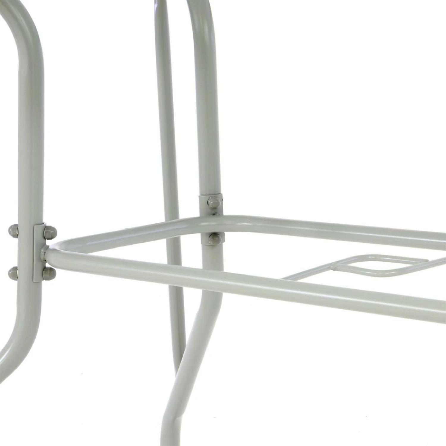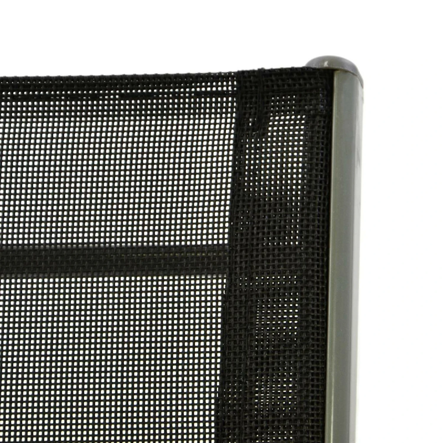 Jeder Stuhl besteht aus grau lackiertem Stahl. Die Sitz- und Rückenflächen der Stühle bestehen aus einer schwarzen elastischen Bespannung aus Textilene. Das ist ein leichtes, robustes Kunststoffgewebe, welche sowohl pflegeleicht ist, als auch viele Witterungseinflüsse verkraftet. Die Stuhlmaße H x B x T: 92 x 55 x 58 cm , Sitzhöhe: 43 cm.